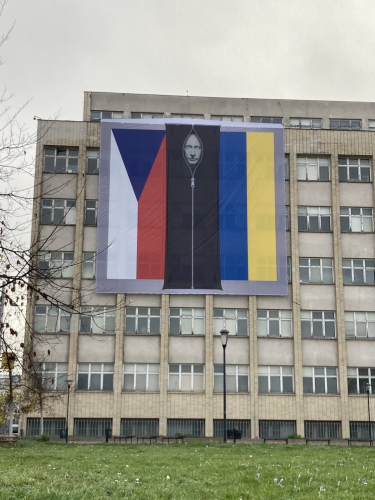 Na vnitru visí vlajky ČR a Ukrajiny s podobiznou Putina ve vaku na mrtvoly