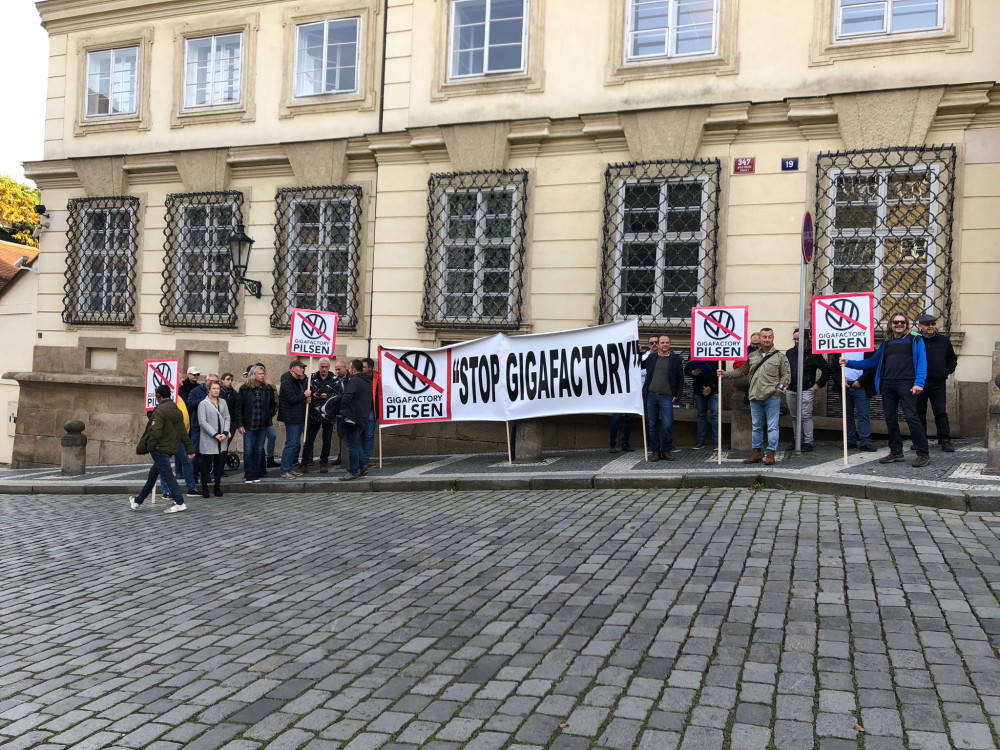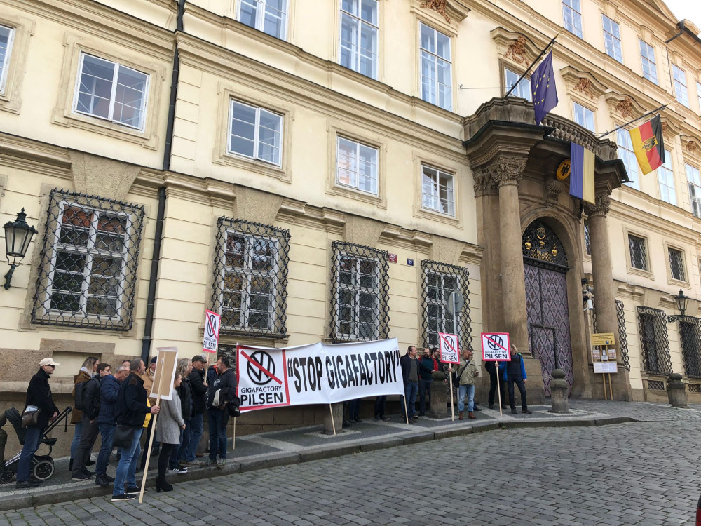 Před německou ambasádou v Praze protestovali piloti z Plzně. Jejich letiště chtějí zrušit kvůli továrně