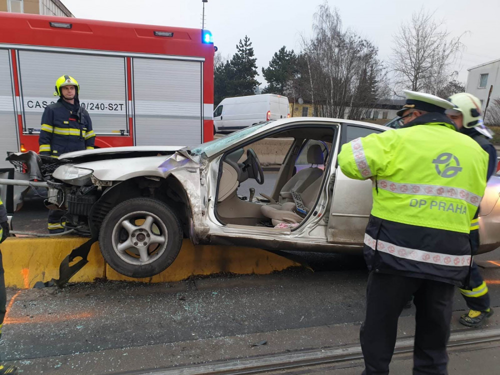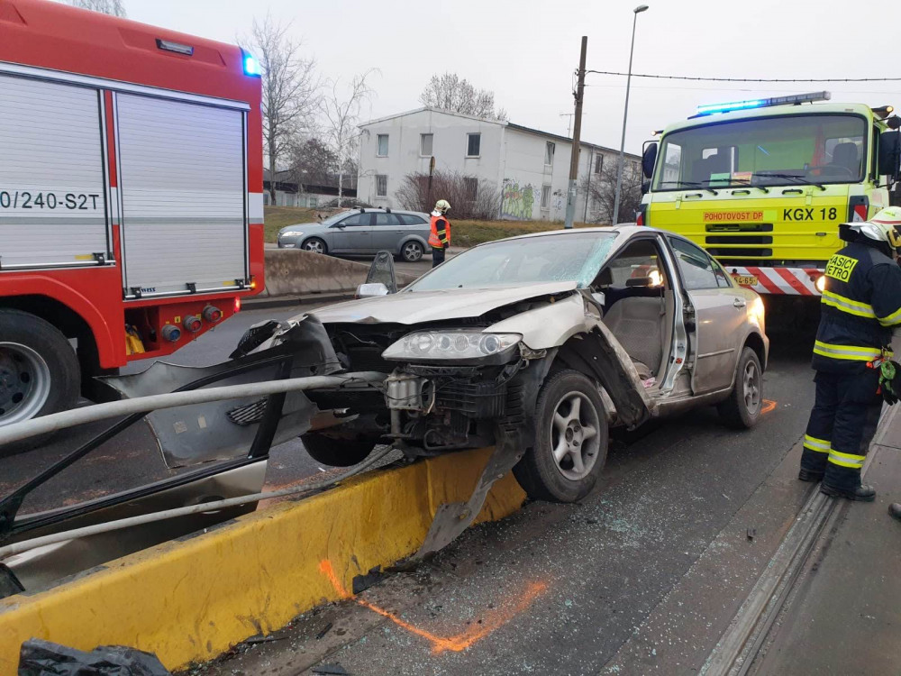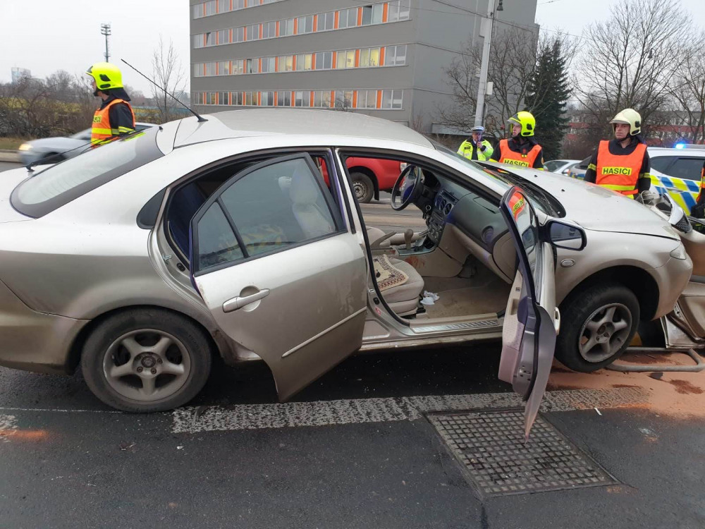 FOTO: Dnes ráno došlo ke střetu tramvaje s autem. Zraněnou osobu museli hasiči z auta vyprostit