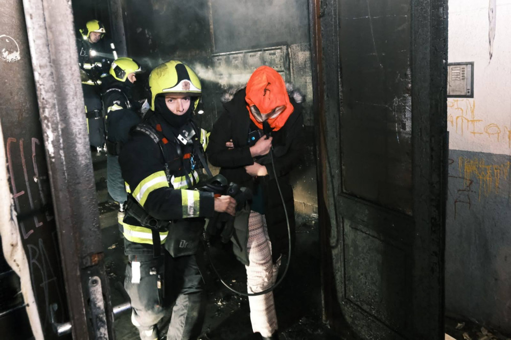 V Trojické ulici hořelo v chodbě domu. Hasiči zachraňovali deset lidí
