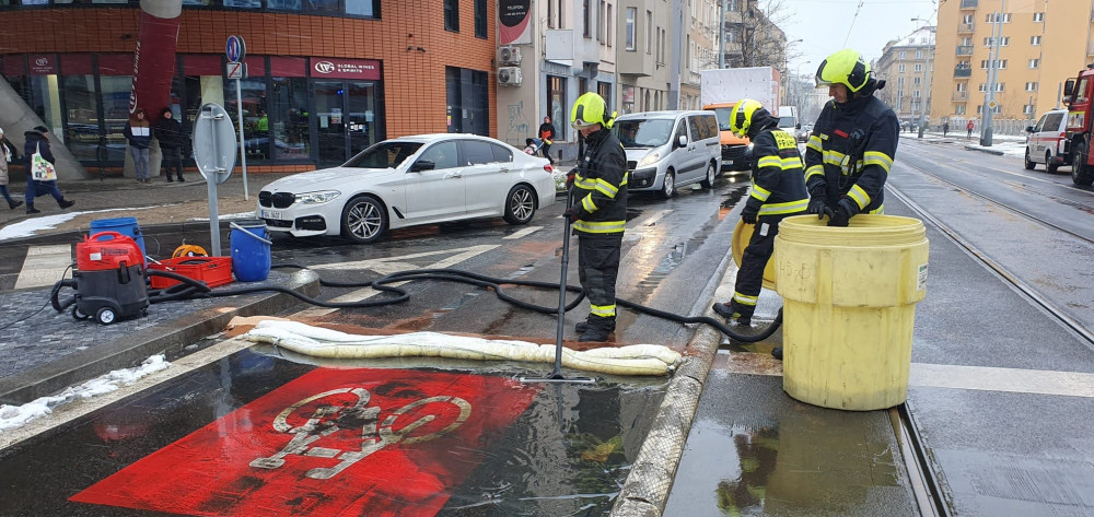 Hasiči řešili únik nafty po srážce automobilu, tramvaje a posypového vozu