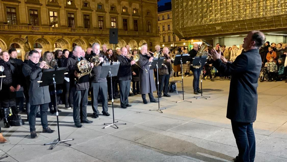 VIDEO: Lidé zpívali ukrajinskou hymnu u Národního divadla, připomněli rok války