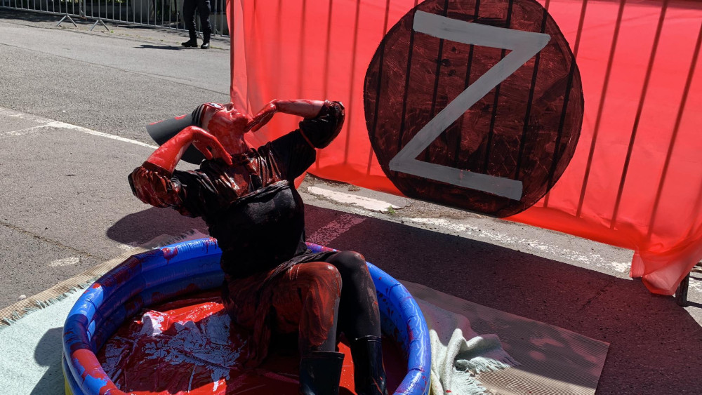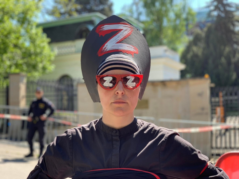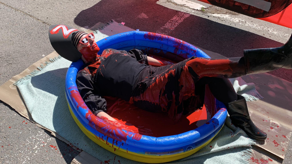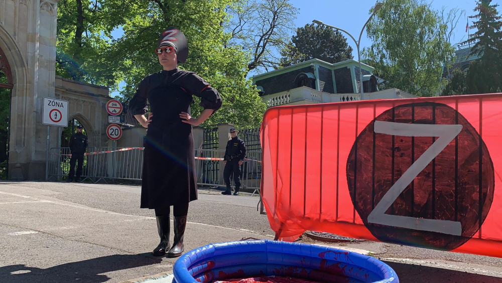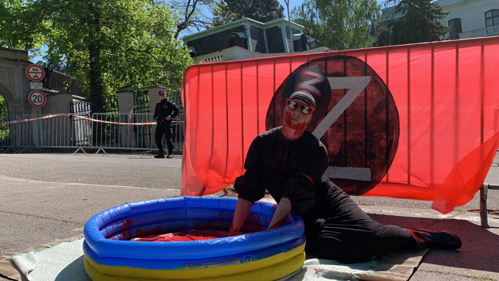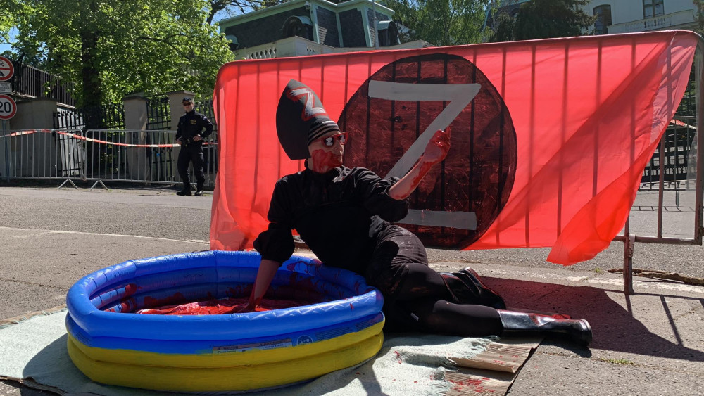 VIDEO: Ruská fašistka se koupala v krvi před ambasádou, připomenula ruský Den vítězství