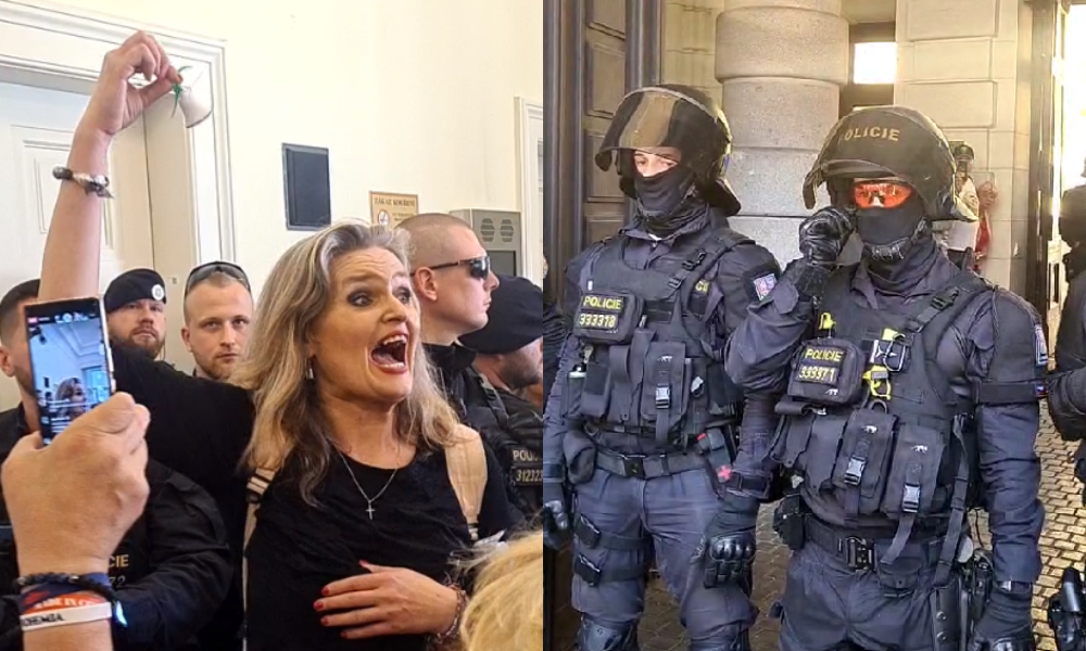 VIDEO: Příznivci Peterkové vylomili dveře do jednací síně, policie dva lidi zadržela