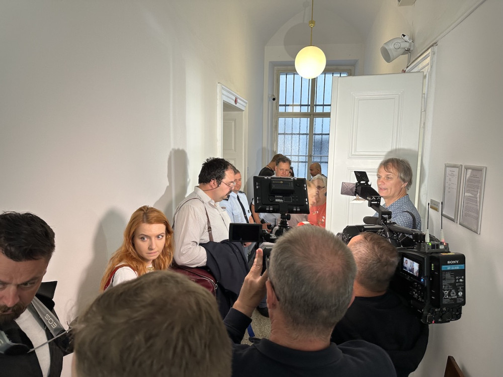 Jaroslav Popelka se svým advokátem Norbertem Naxerou a jedním z příznivců