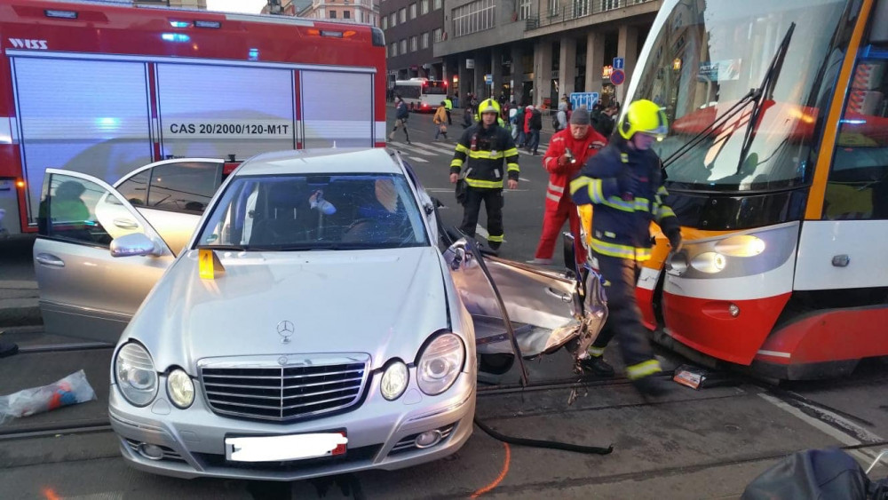 Dvě osoby musely být vyproštěny po střetu auta s tramvají na náměstí I. P. Pavlova