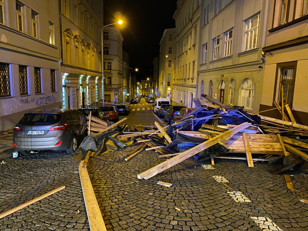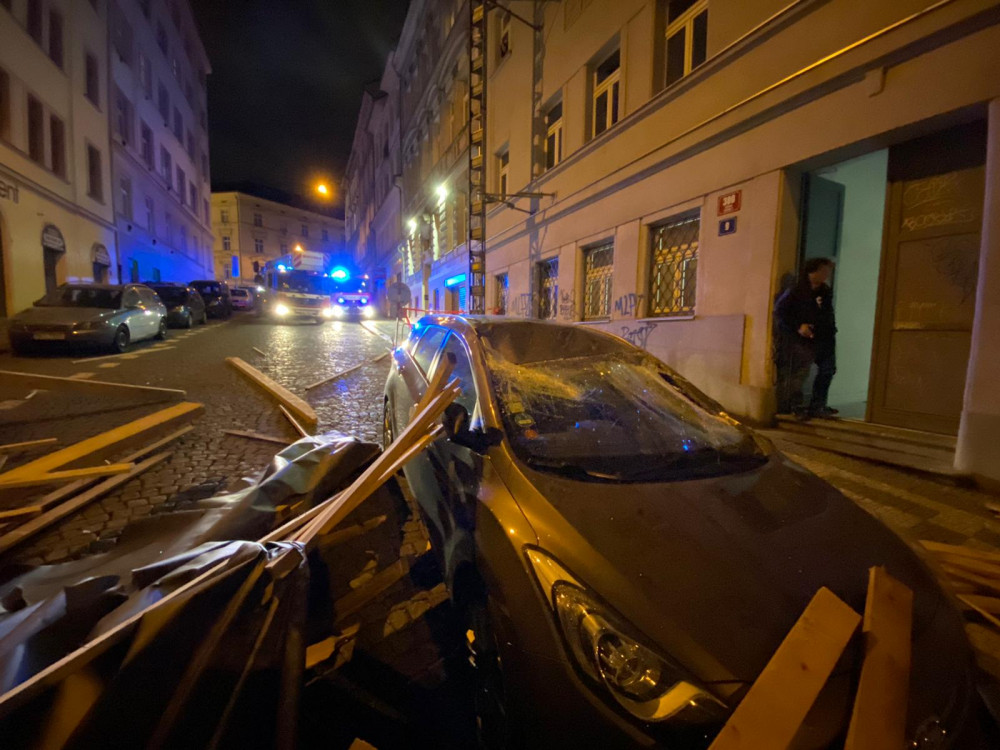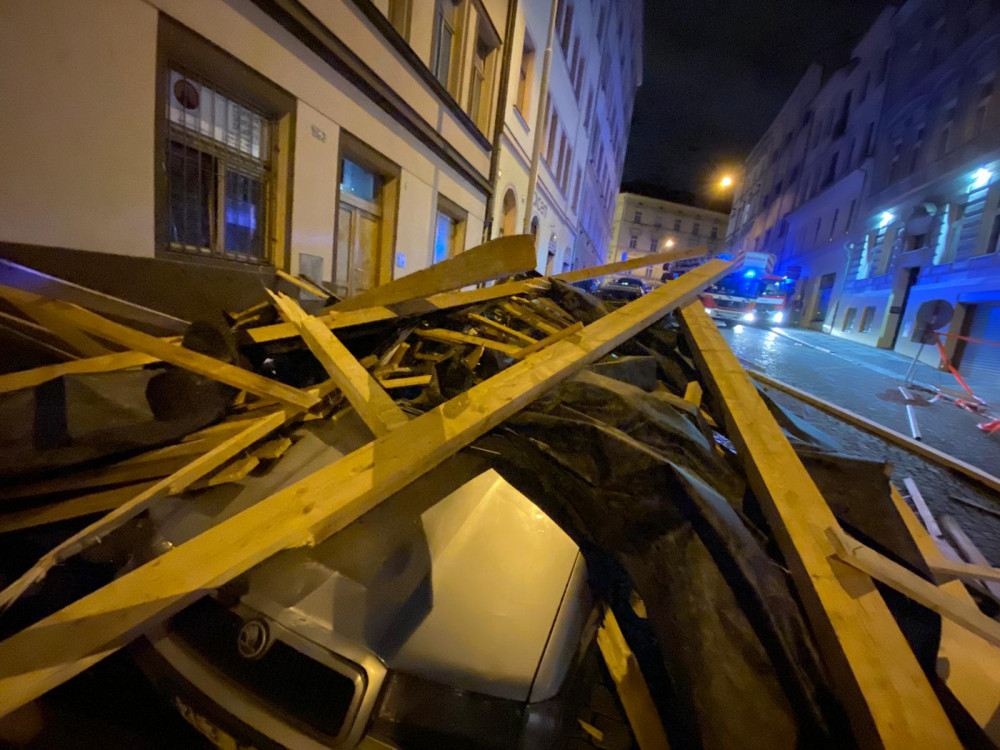 FOTO, VIDEO: Trámy z rozestavěné střechy na Žižkově zasypaly několik zaparkovaných aut