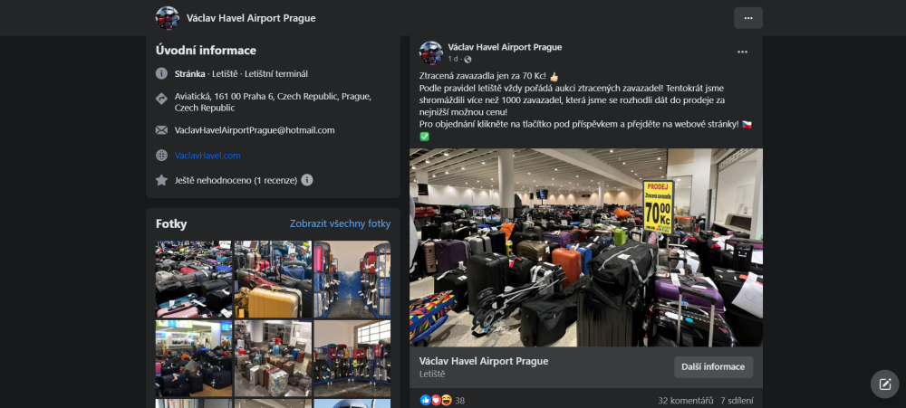 Podvodníci zneužívají jméno Letiště Praha. Na falešném profilu nabízejí ztracené kufry