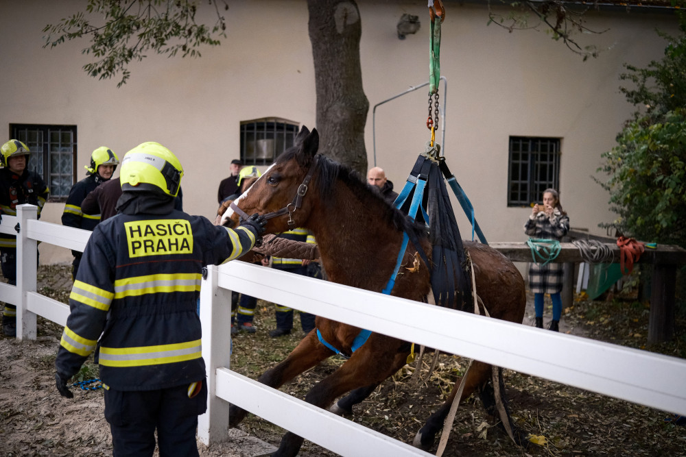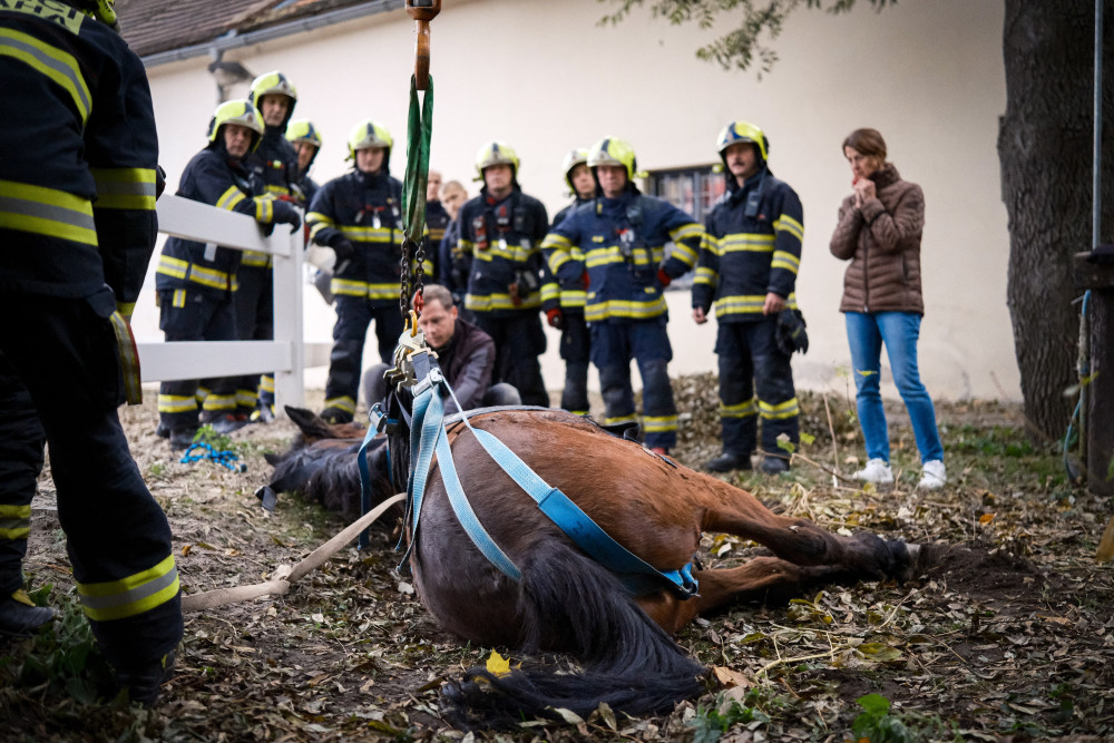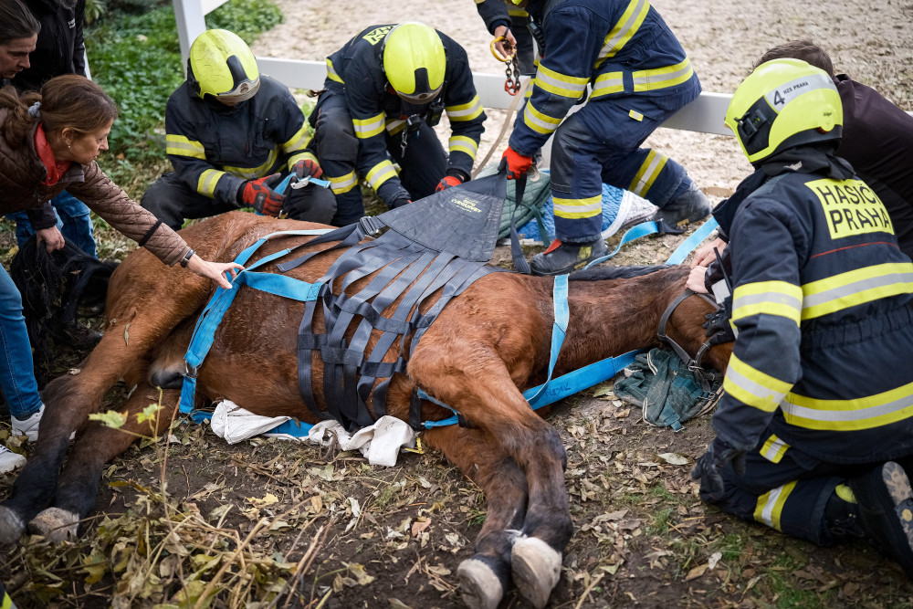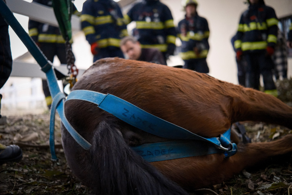 VIDEO: Zraněný kůň se nemohl postavit na nohy. Pomohli mu hasiči s vyprošťovacím autem