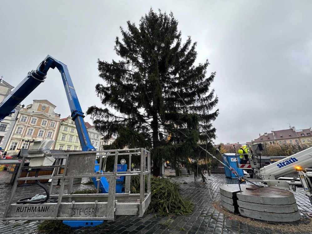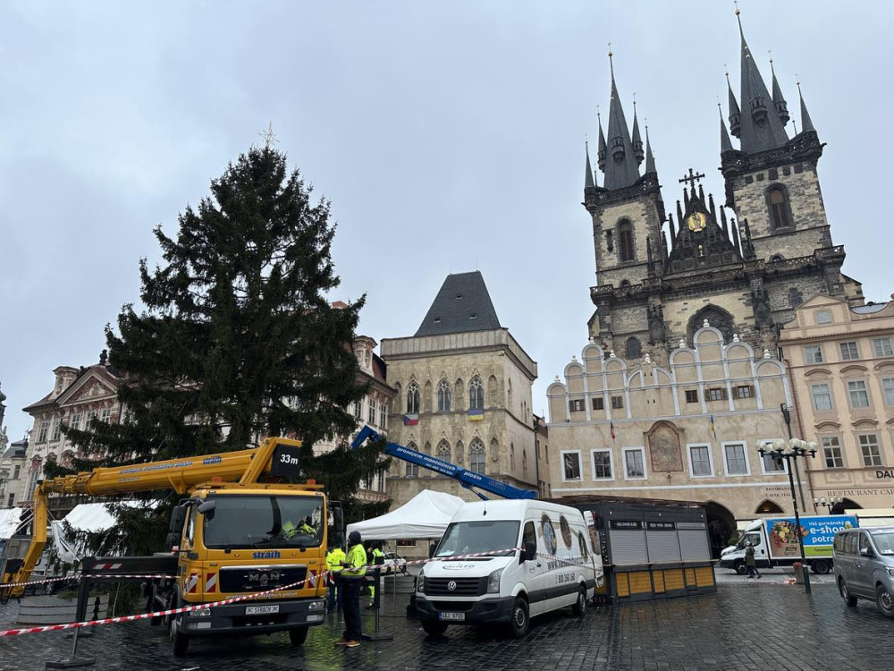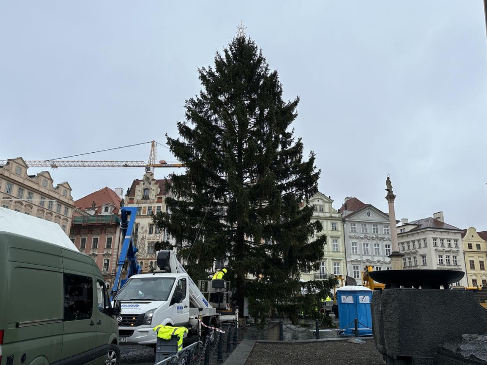 Vánoční strom dorazil do Prahy. Od noci stojí na Staroměstském náměstí