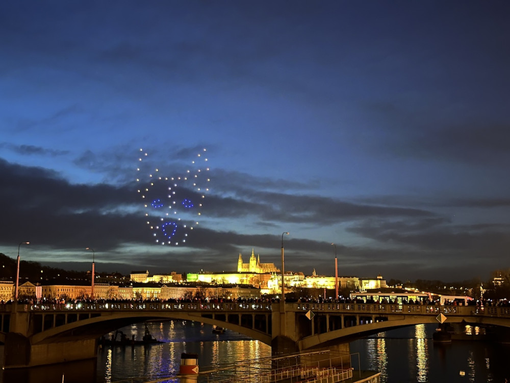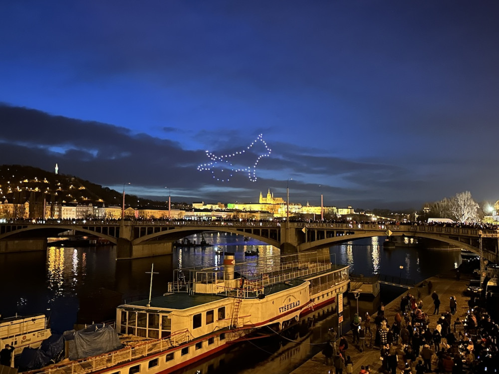 VIDEO: Pes Gump pozdravil Pražany v dronové show nad Vltavou. Vedení města stroje zvažuje místo ohňostrojů