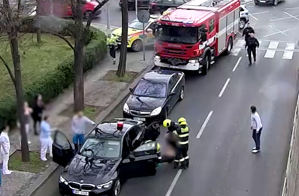 VIDEO: Muž zkolaboval za volantem přímo na silnici. Ze zamknutého auta ho zachránili policisté a hasiči