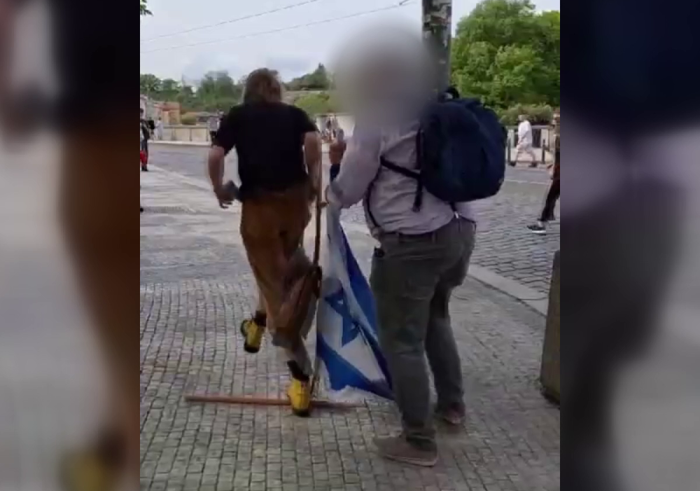 VIDEO: Výtržník zlomil muži izraelskou vlajku. Může za to do vězení až na dva roky