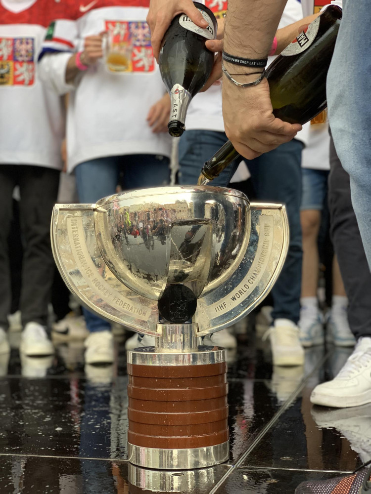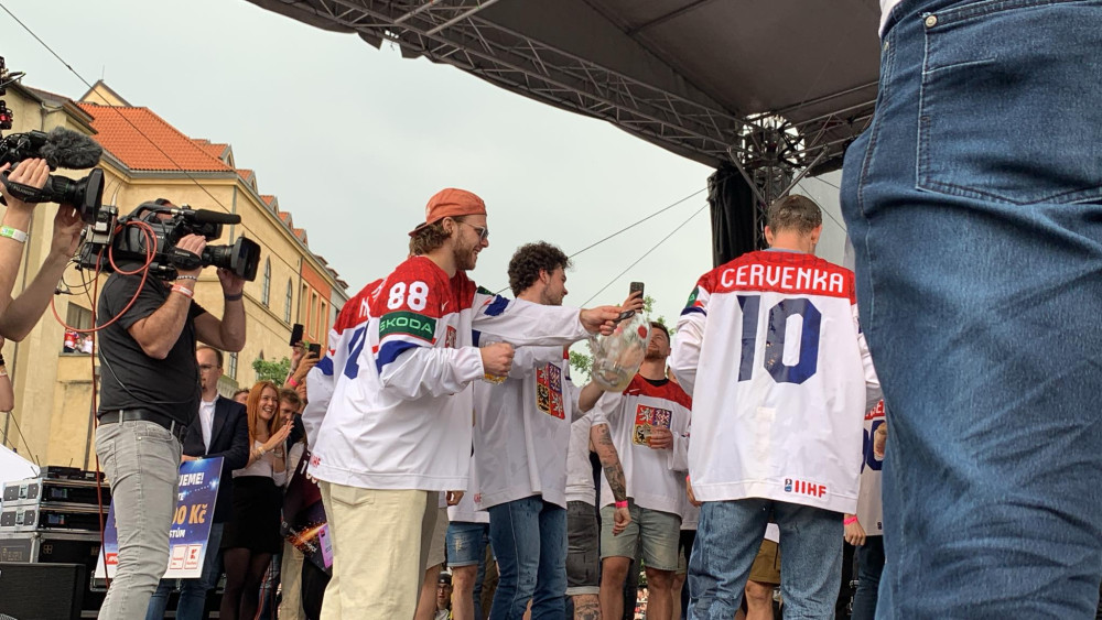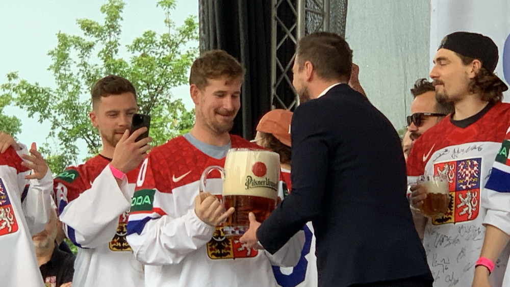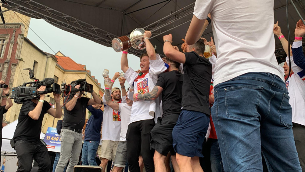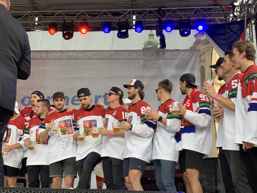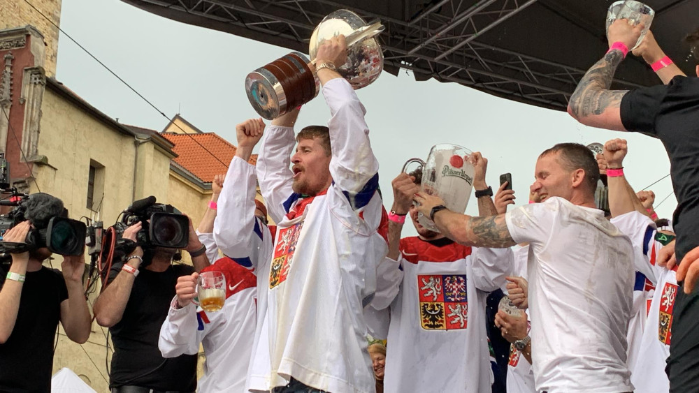 FOTOGALERIE: Pivní sprcha, šampaňské v poháru. Zlatí hoši řádili na Staroměstském náměstí