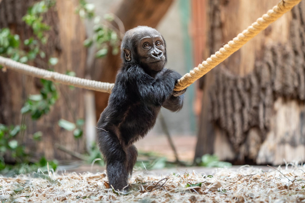 Mobi se přidržuje lana v expozici a pozoruje návštěvníky pavilonu Rezervace Dja