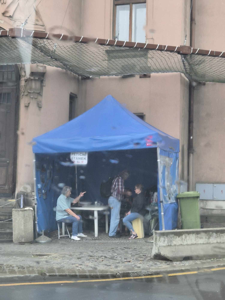 Další přesun petičního stánku u úřadu vlády. Tentokrát ho stěhovali na Klárov