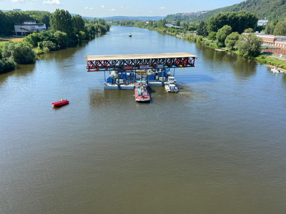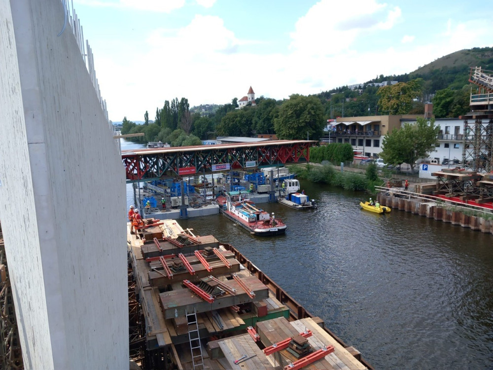 Tak se veze 150 tun oceli po Vltavě. Ke Dvoreckému mostu připlula konstrukce pro betonování mostovky
