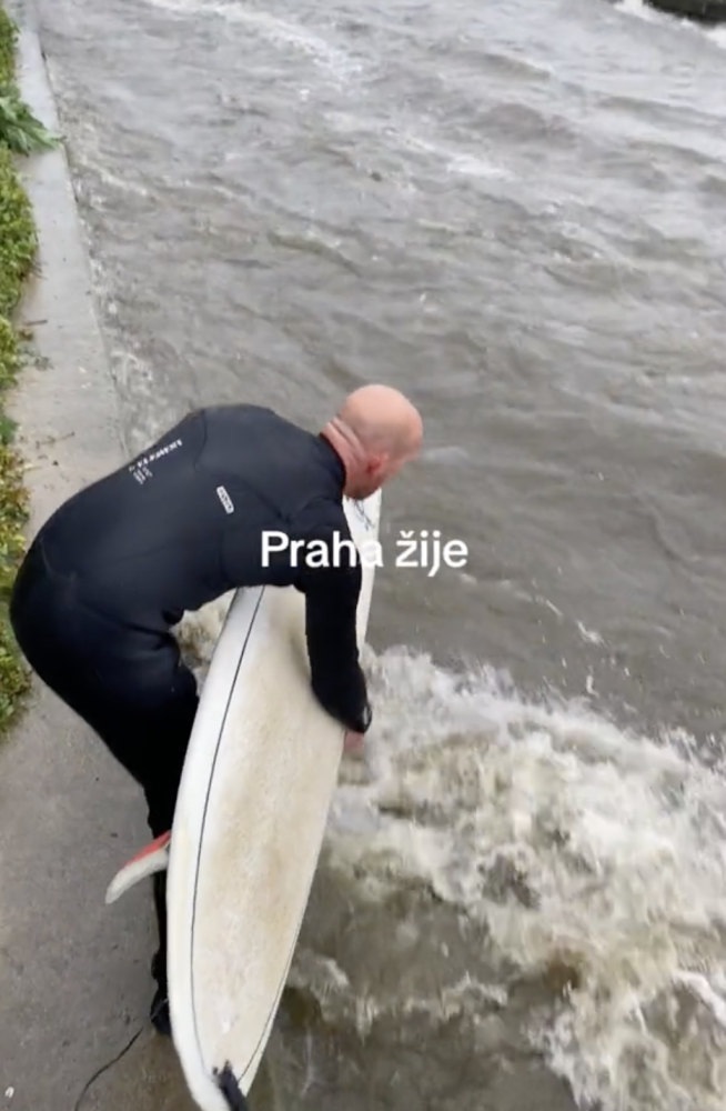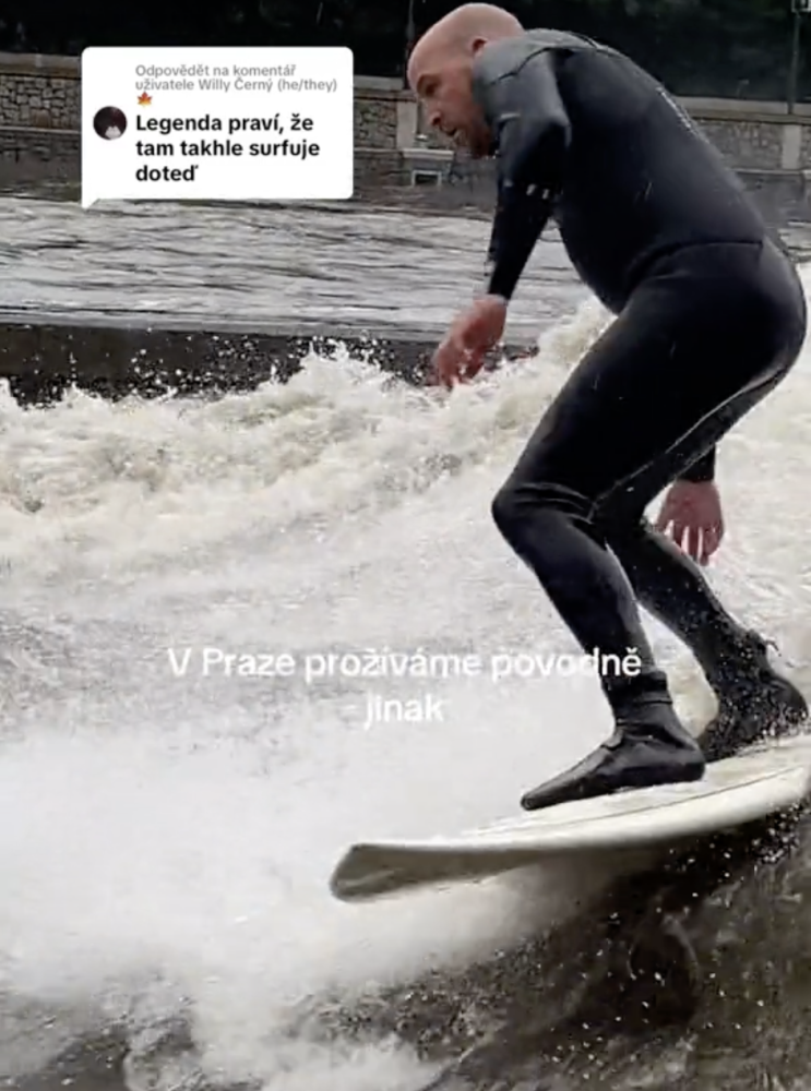 VIDEO: Vyjížďka na kajaku, surfování. Lidé si z rozvodněné Vltavy dělají sportoviště