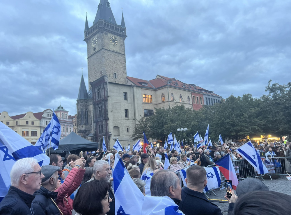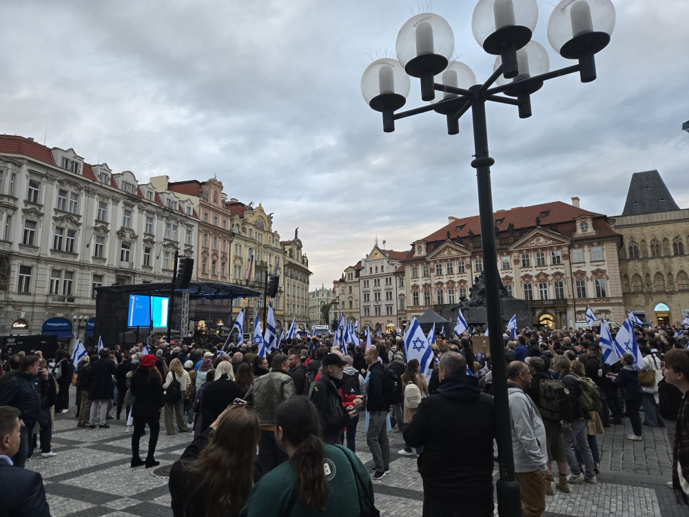 Stovky lidí si na Staroměstském náměstí připomněly výročí útoku Hamásu na Izrael. Na akci dohlíželi policisté