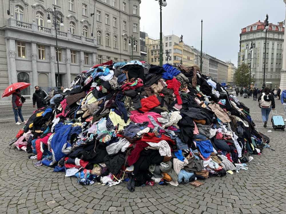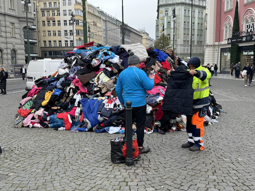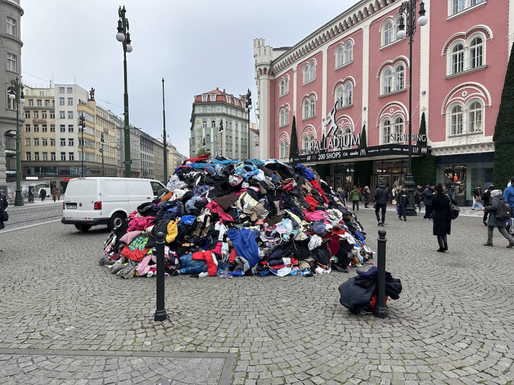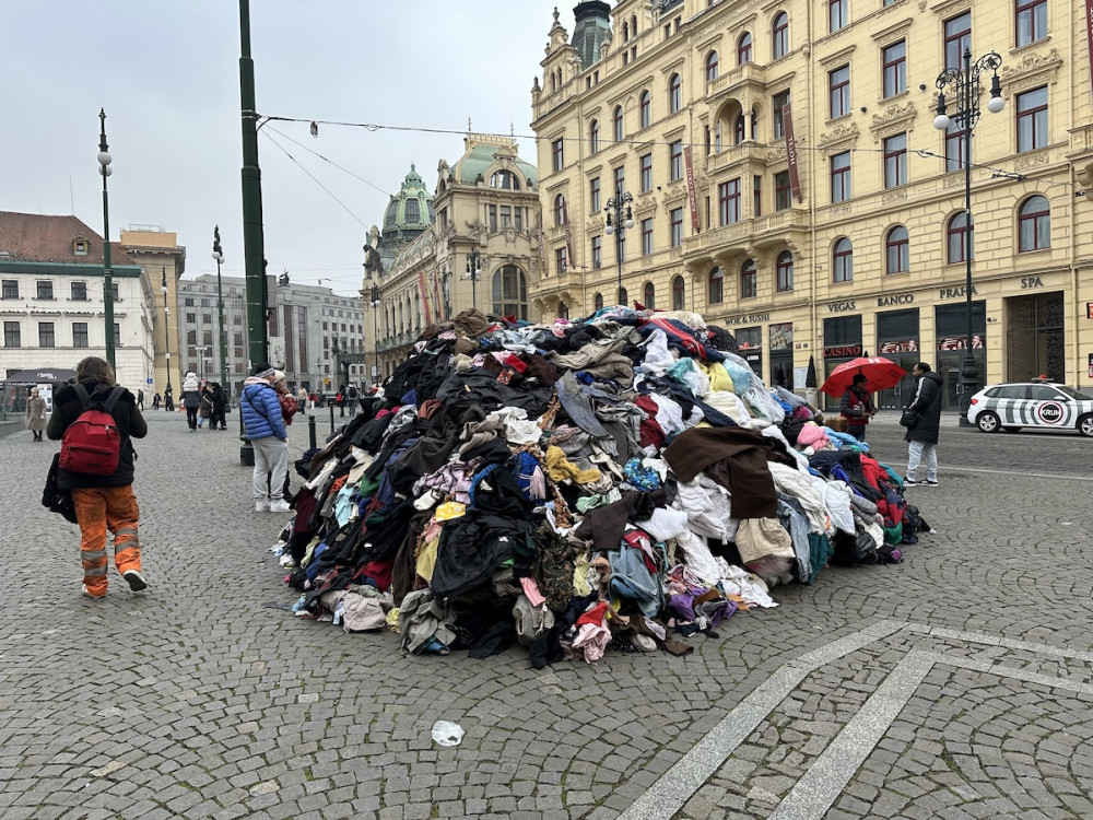 VIDEO: Hromadu oblečení nechalo vyhodit v centru Prahy hlavní město. Má upozornit na nadbytek textilního odpadu