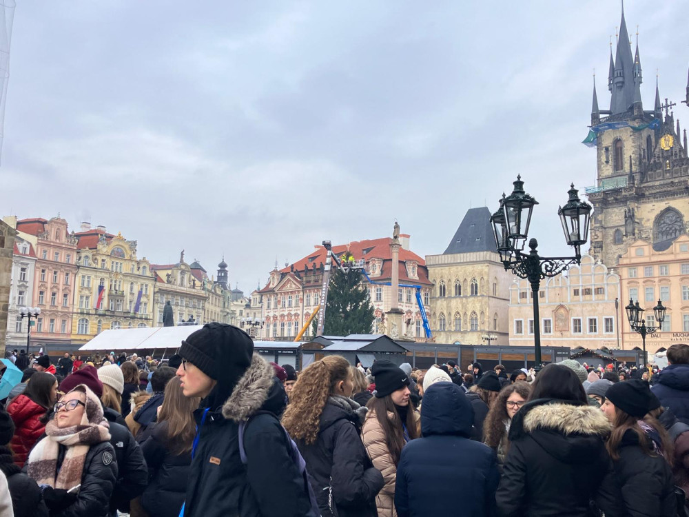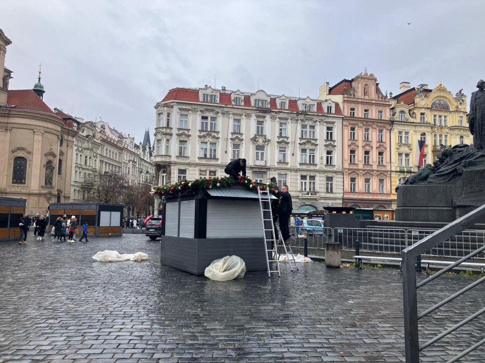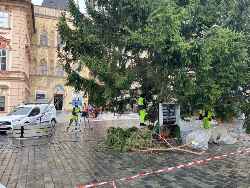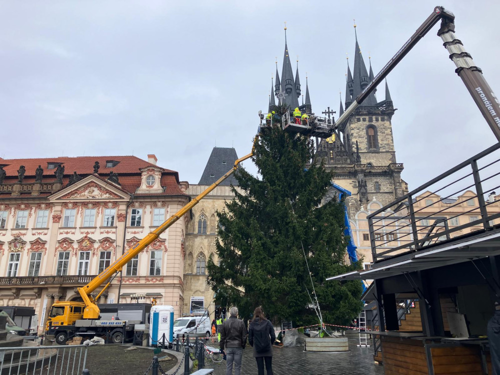 Technici v noci ukotvili vánoční strom na Staroměstském náměstí a začali se zdobením