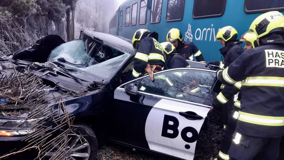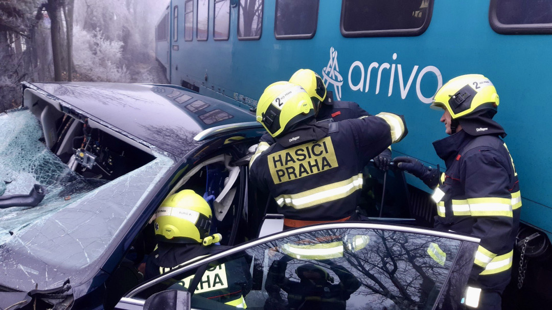 Vlak na přejezdu v Praze smetl auto, řidiče museli hasiči vystříhat