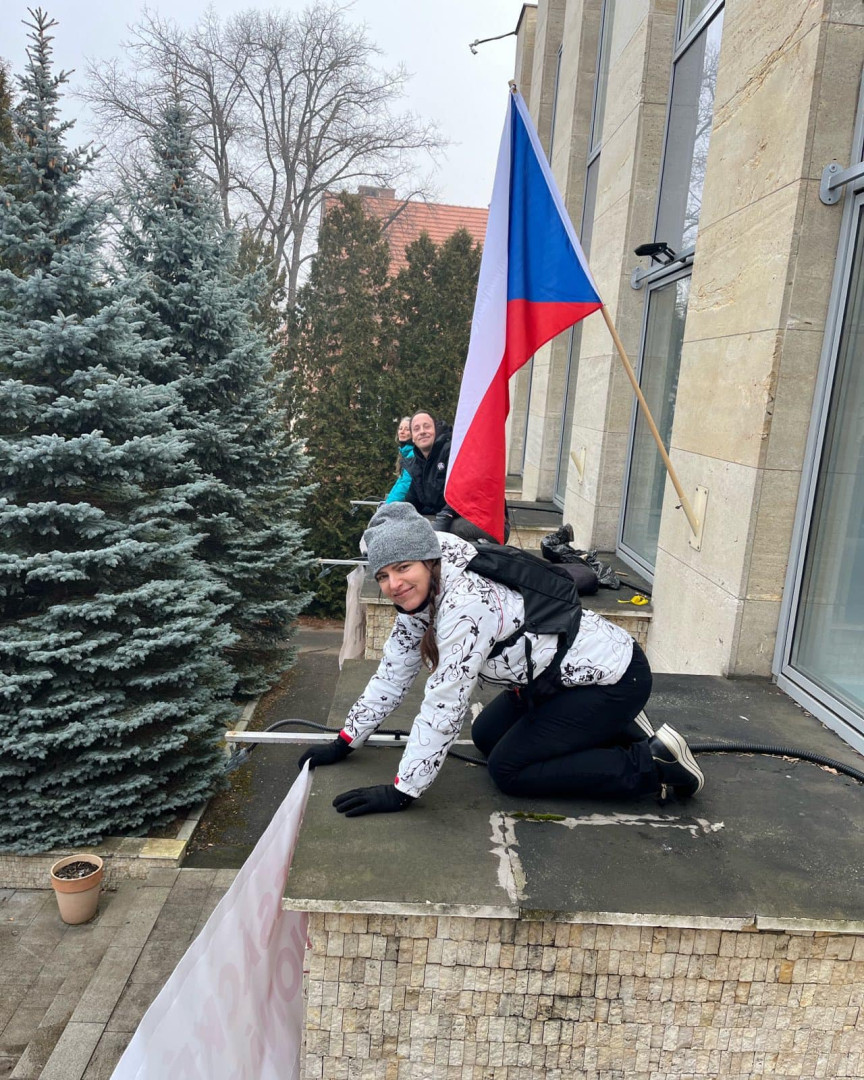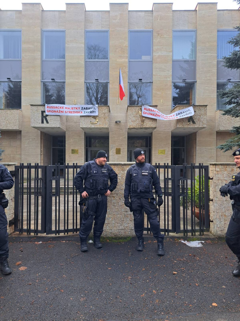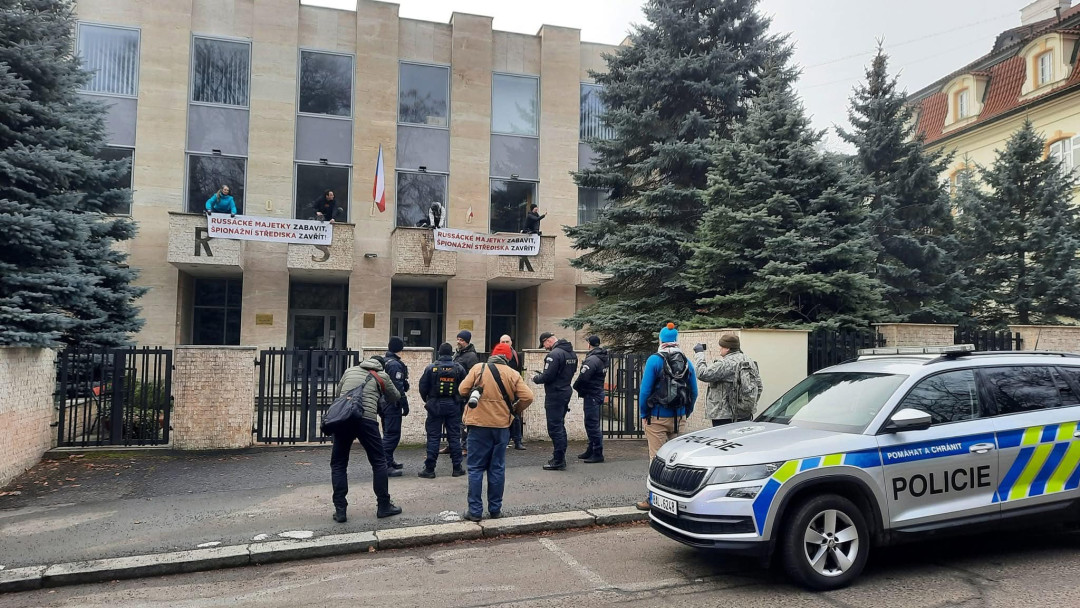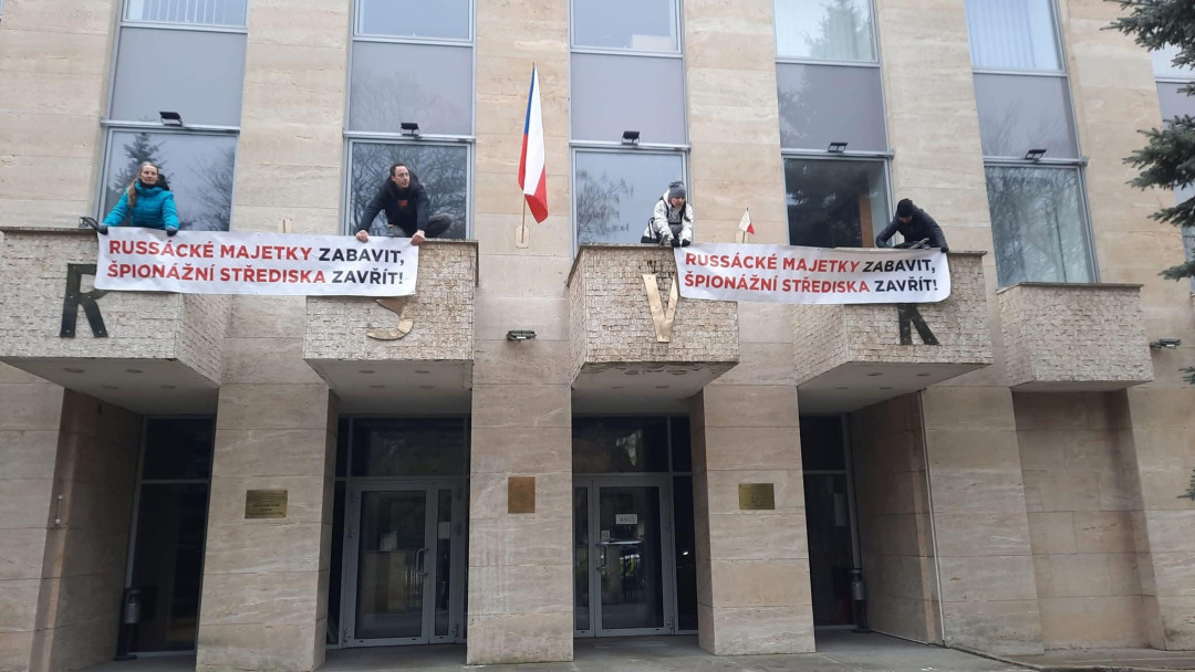 Aktivisté vyvěsili v areálu Ruského střediska vědy a kultury transparenty a požadovali jeho uzavření