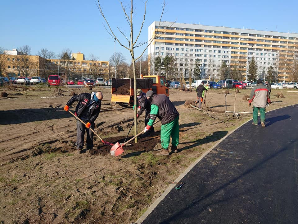 Parkoviště u Jiřetínské ulice se mění v park. Praha 9 vysazuje stromy