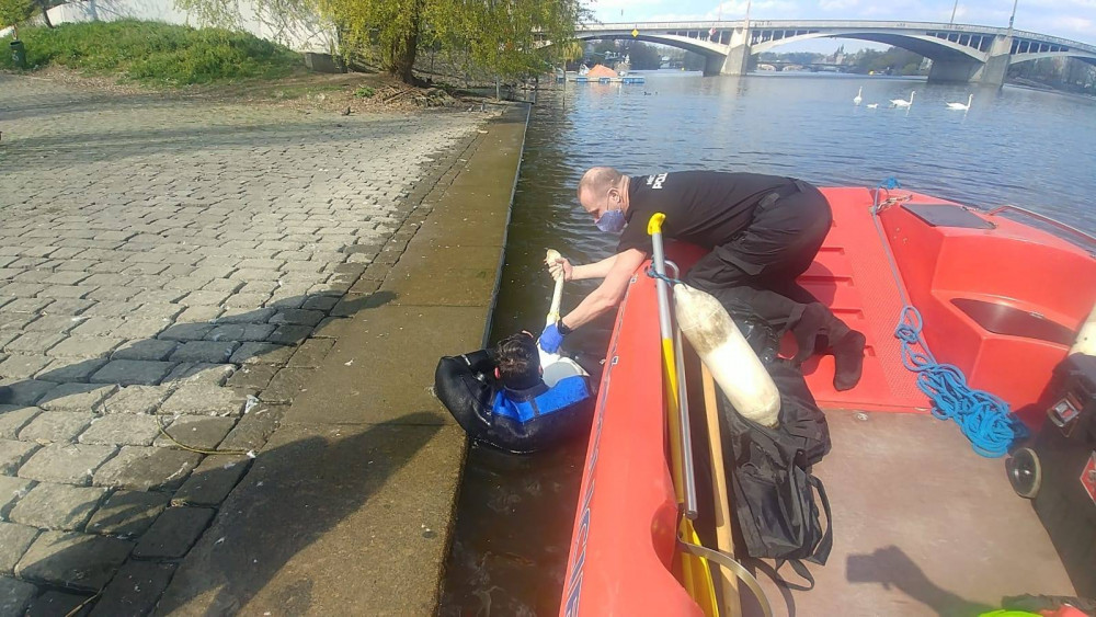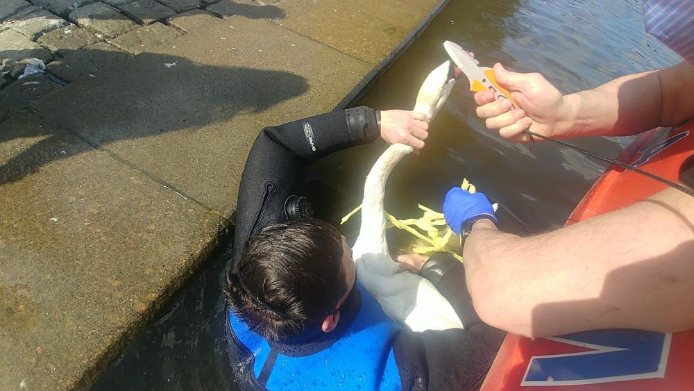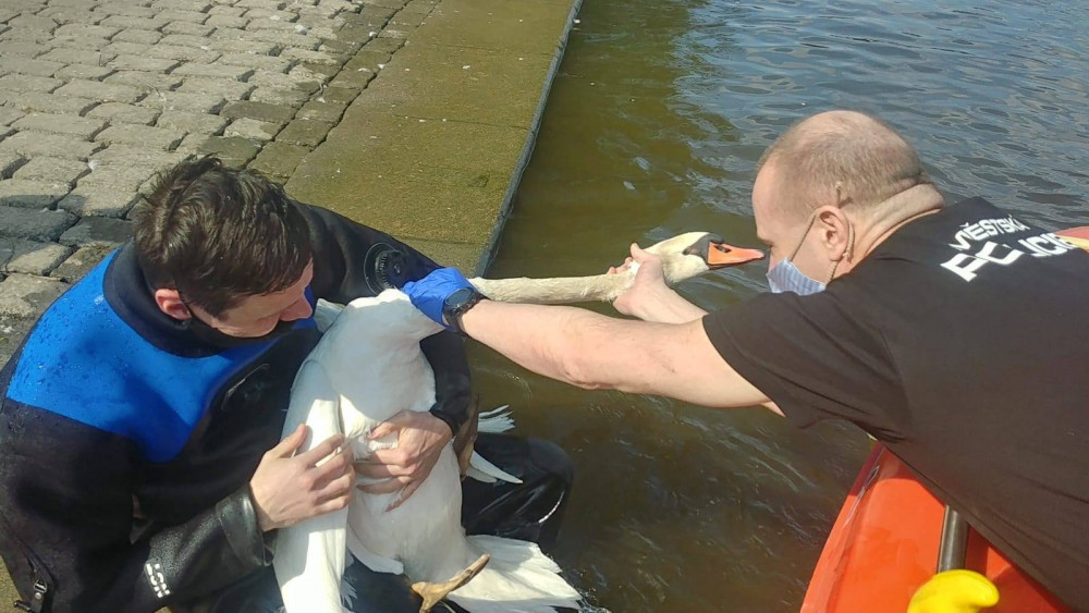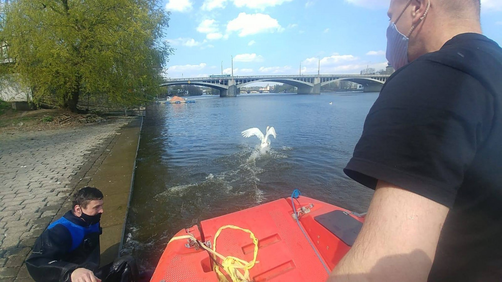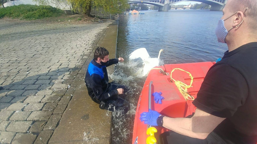 FOTO: Strážníci zachránili labuť, která měla krk a nohy zamotané v igelitu