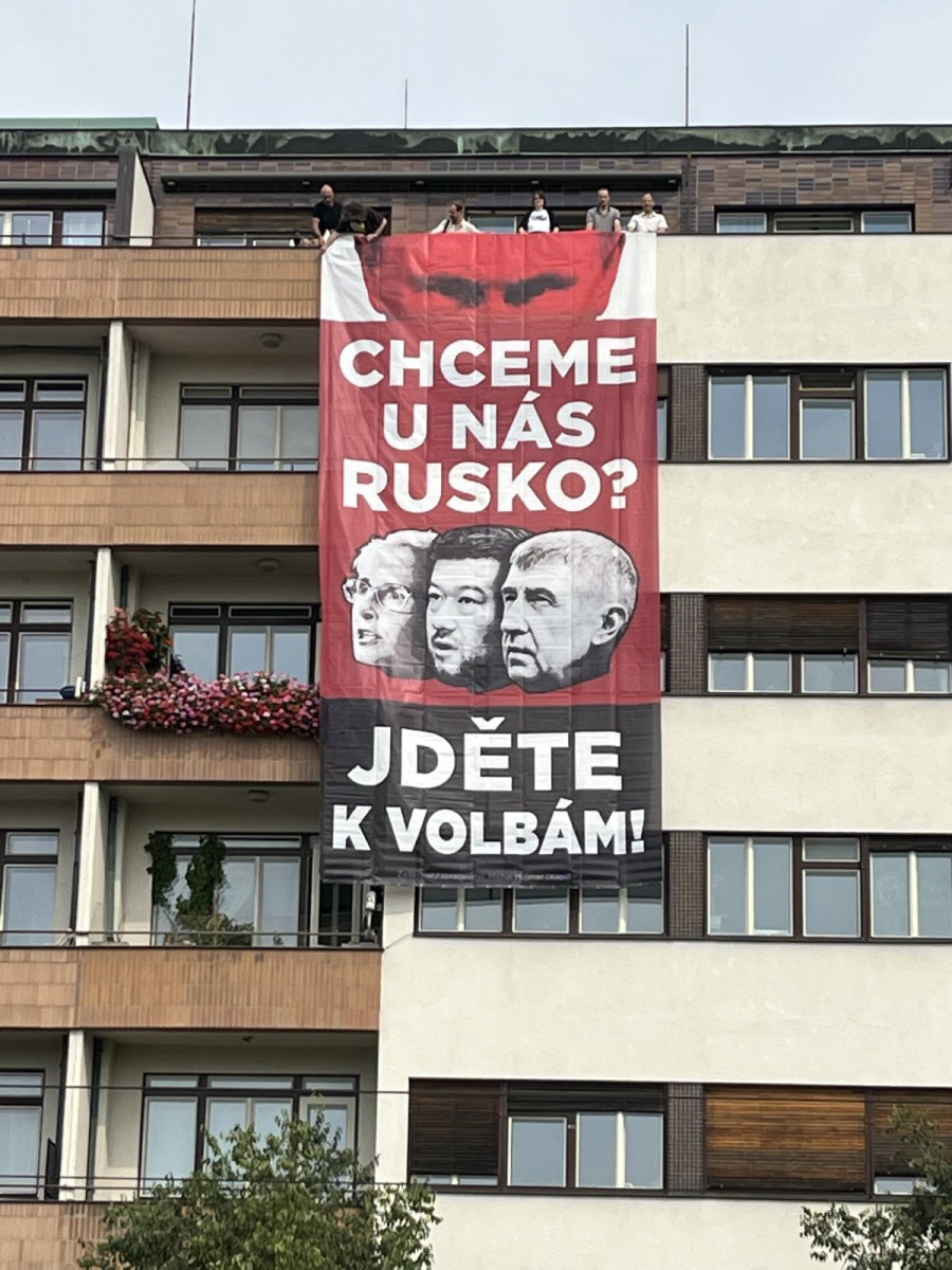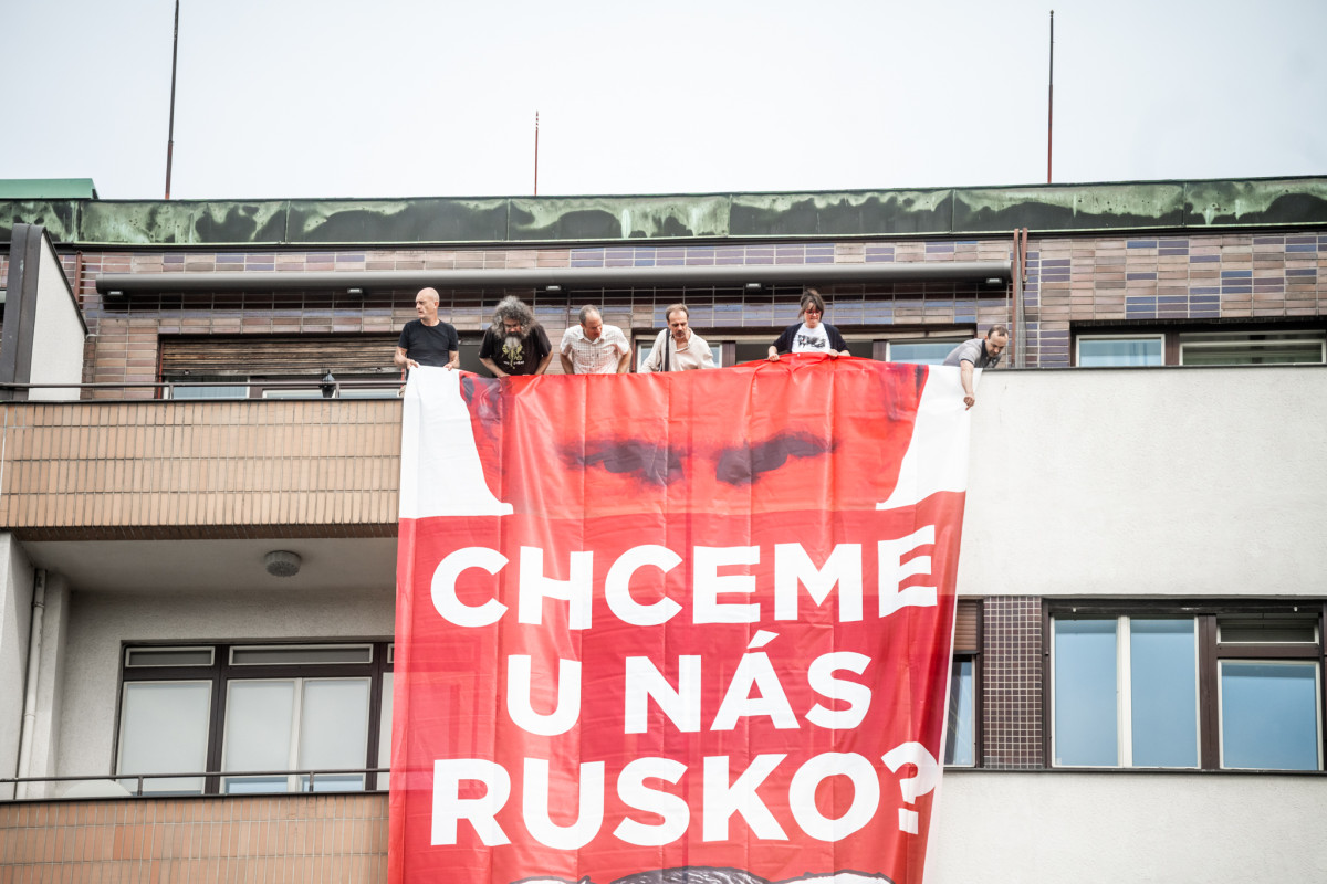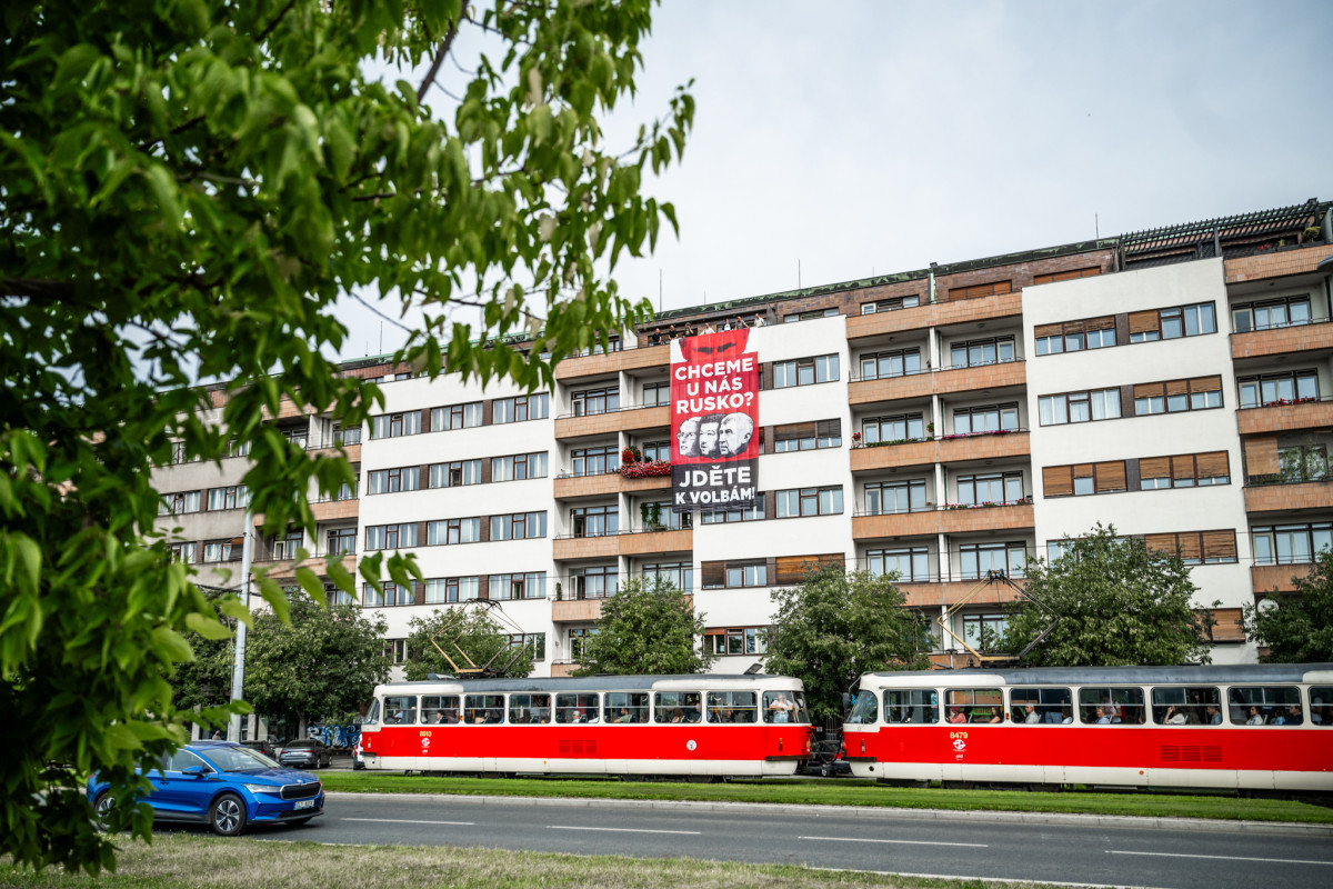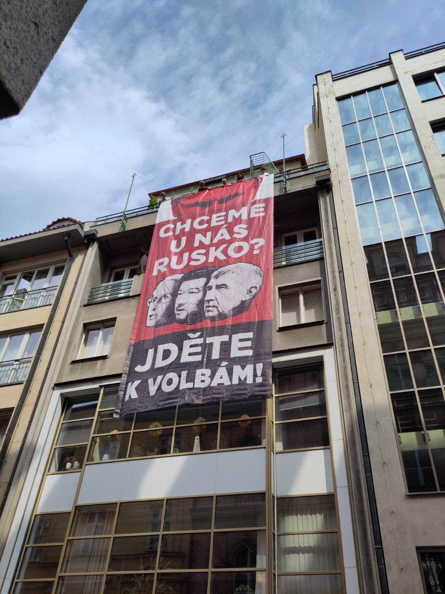 Skupina Kaputin vyvěsila na budovách v Praze plakát s Putinem a českými politiky