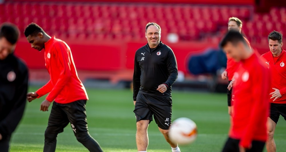 Fotbalisté Slavie se po pauze vrací k cvičením s míčem pro dvojice