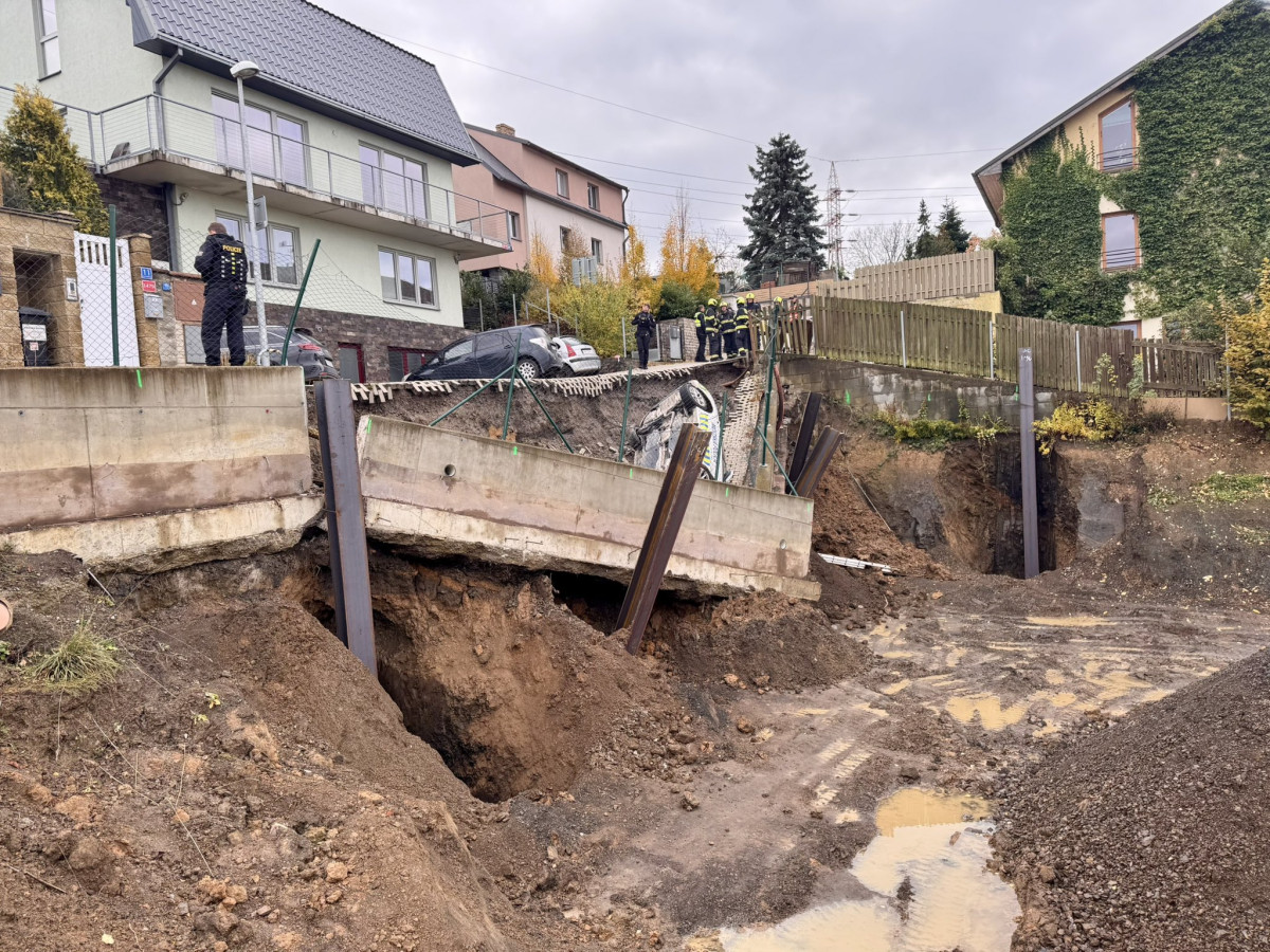 Na stavbě v Praze se utrhl svah, auto městské policie skončilo na střeše
