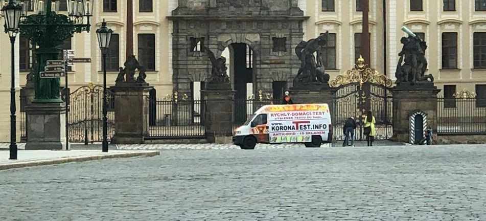 Mynář zabiják! Před Pražským hradem se v noci objevil vrak dodávky vybízející k nákupu testu na koronavirus