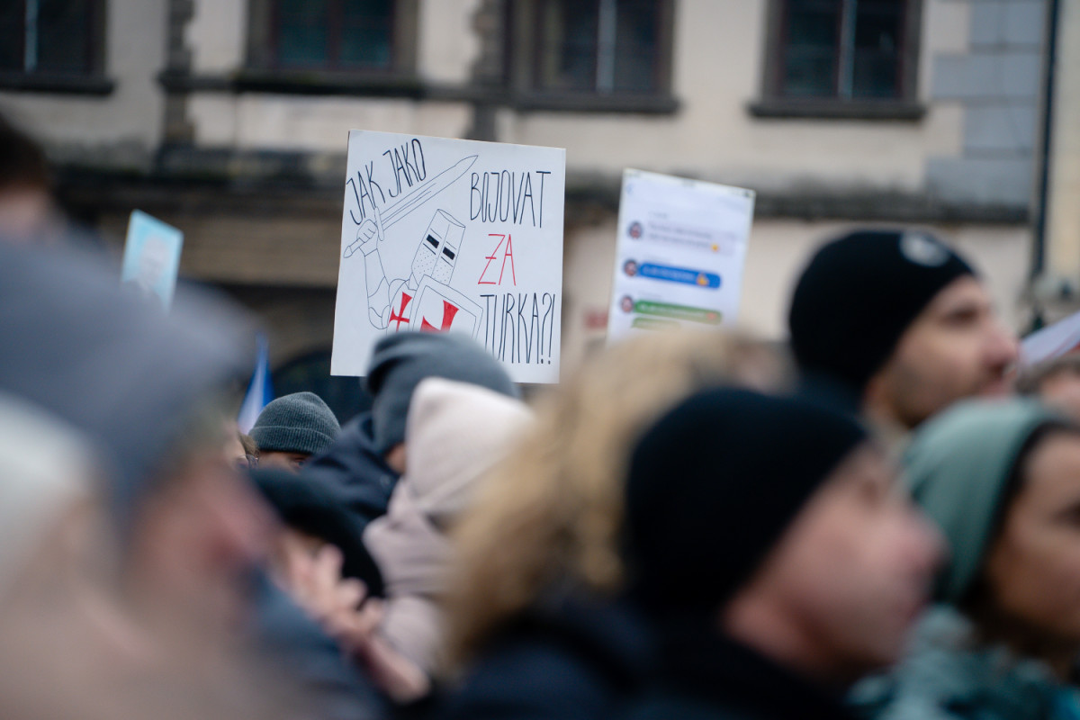 FOTO: Flanelky i provokativní transparenty. Demonstrace na Staromáku dala prostor kreativitě