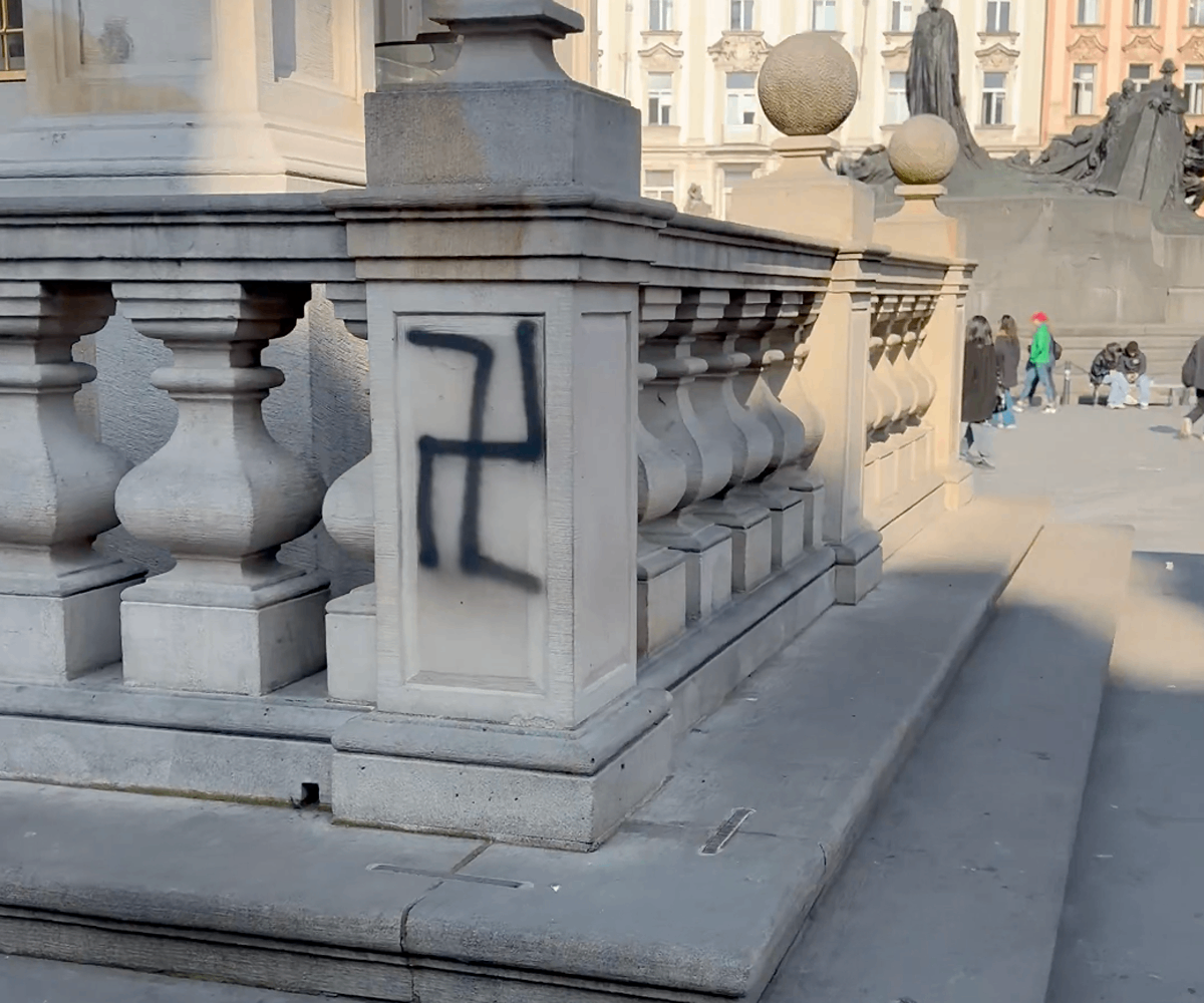 Vandal řádil u Mariánského sloupu. Na památku načmáral nacistický symbol