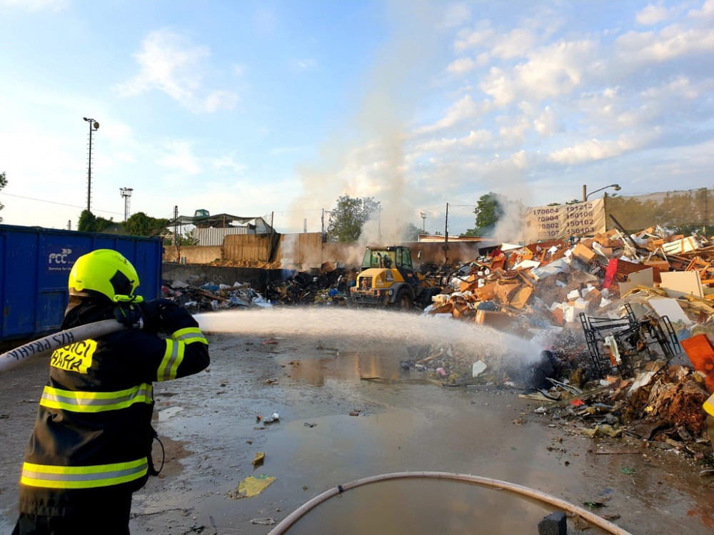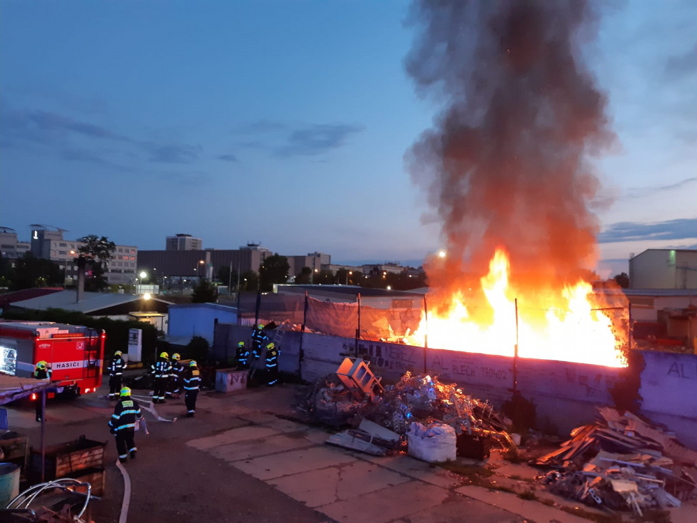 FOTO: Hasiči zasahovali u požáru v kovošrotu. Příčina vzniku je v šetření