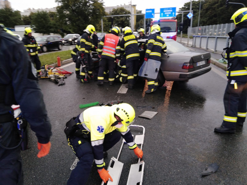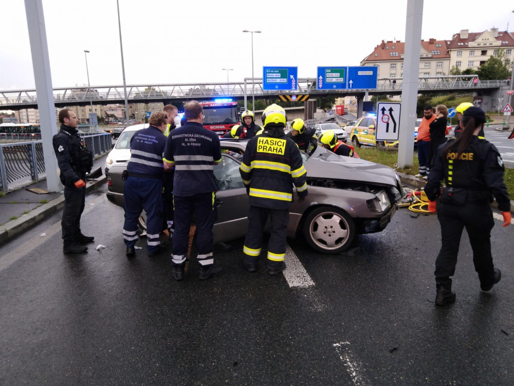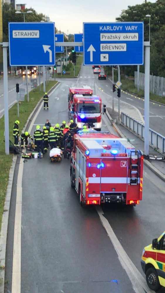 FOTO, VIDEO: Nehoda přerušila provoz ve Strahovském tunelu. Řidič je zraněný