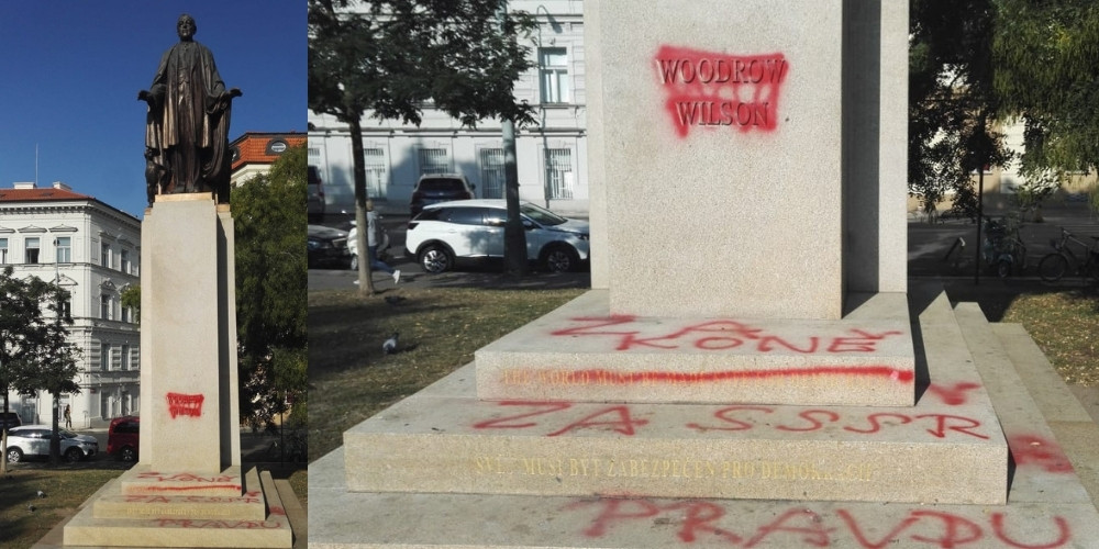 Za Koněva, za SSSR. Někdo posprejoval sochu Wilsona ve Vrchlického sadech