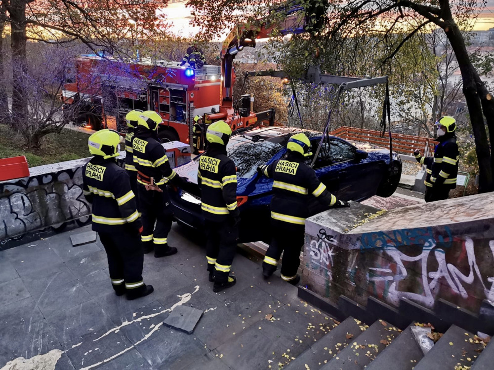 Kuriózní nehoda v Praze. Řidič jel po Nuselském mostě v protisměru, auto skončilo na schodech