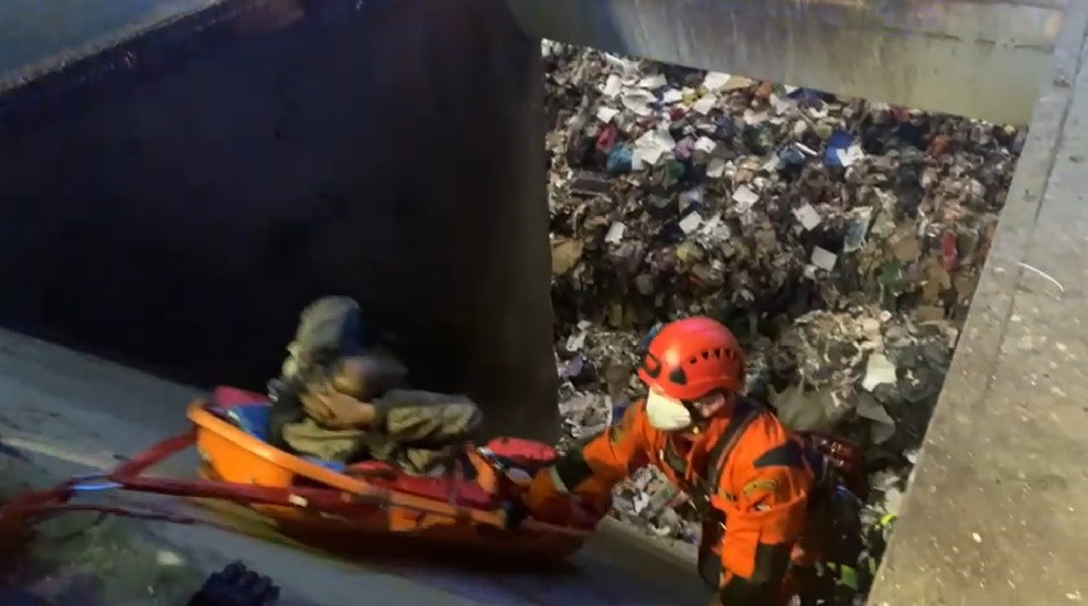 VIDEO: Hasiči zachránili ze spalovny bezdomovce, kterého do šachty vysypalo popelářské auto