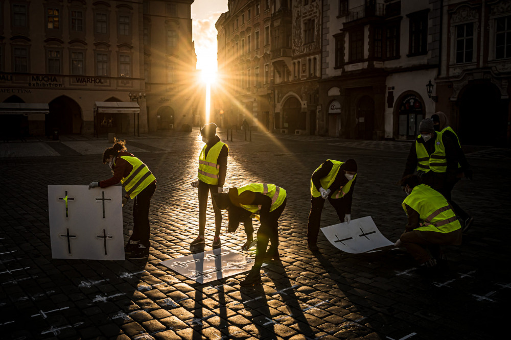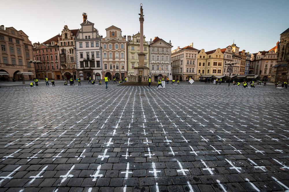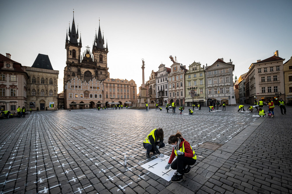 Křížky za zemřelé s covidem zůstanou na dlažbě Staromáku, dokud je nesmyje déšť
