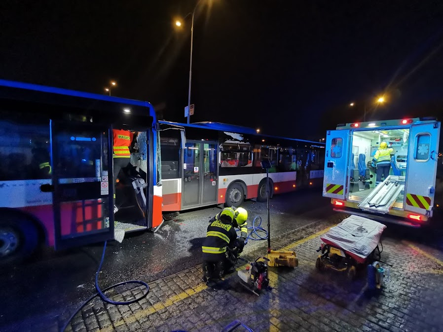 Noční nehoda dvou autobusů. Řidiče museli hasiči vyprošťovat.