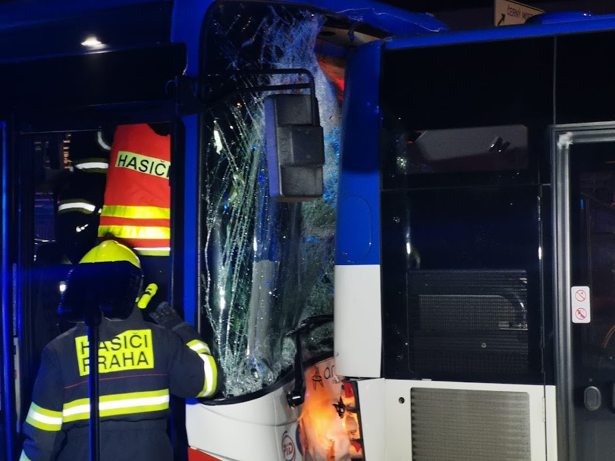 Noční nehoda dvou autobusů. Řidiče museli hasiči vyprošťovat