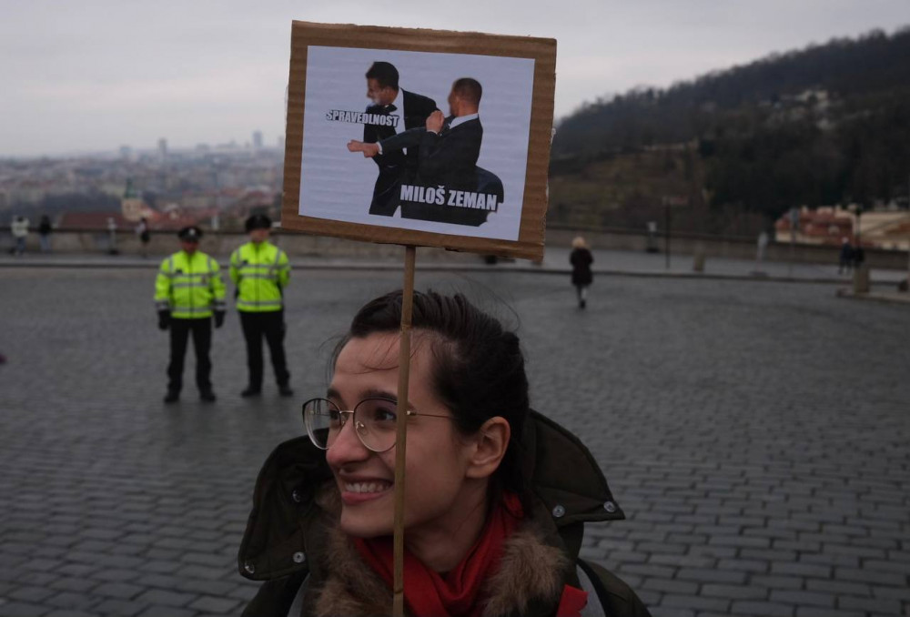 U Pražského hradu se sešlo pet set demonstrantů. Vyzvali prezidenta Zemana k abdikaci