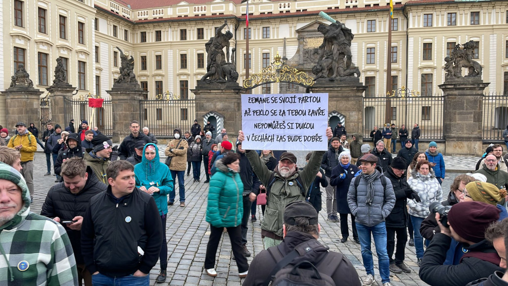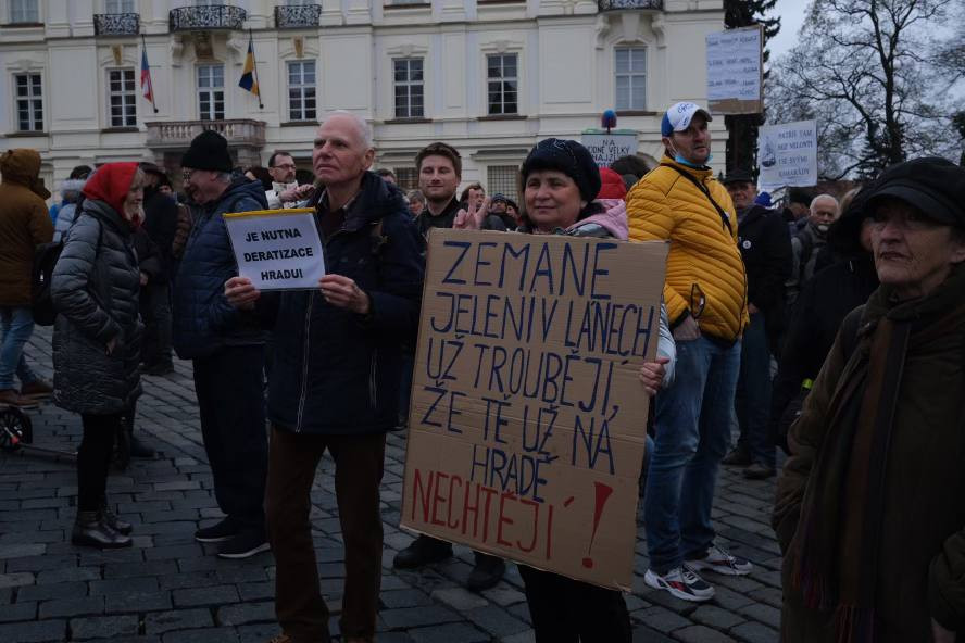 U Pražského hradu se sešlo pět set demonstrantů. Vyzvali prezidenta Zemana k abdikaci