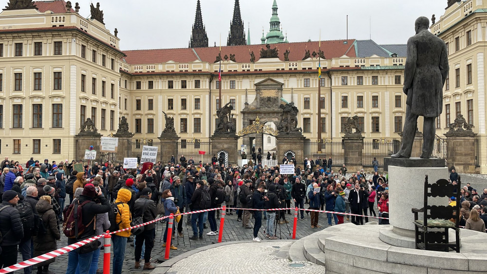 U Pražského hradu se sešlo pet set demonstrantů. Vyzvali prezidenta Zemana k abdikaci