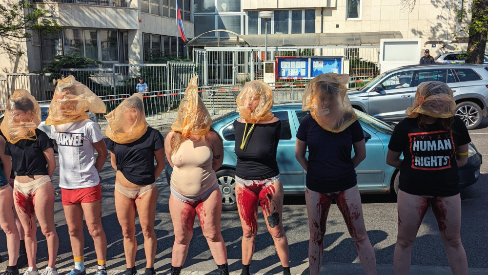 Drsný protest před ruskou ambasádou. Falešná krev a igelitky na hlavě