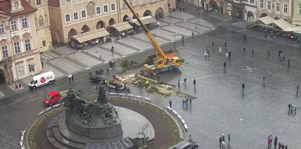 Vánoční strom na Staromáku šel k zemi. Na větvích si pochutnají zvířata ze zoo