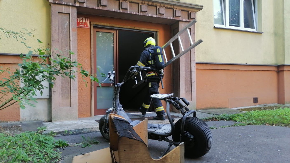 Ve sklepě domu v Praze hořela elektrokoloběžka. Jeden člověk skončil v péči záchranářů