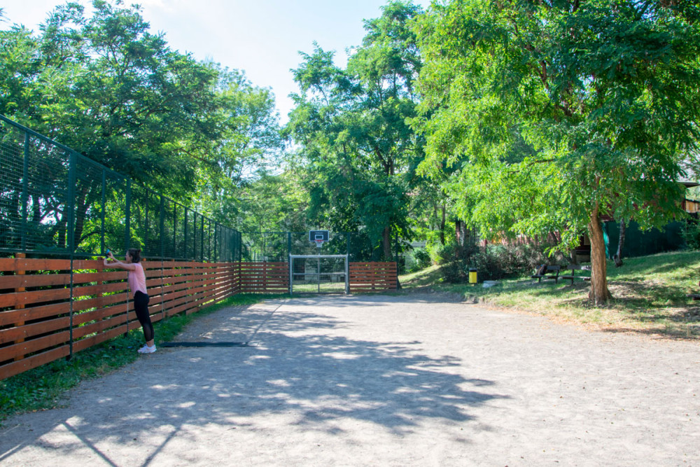 Z plácku v Praze 10 je hřiště. Má rovný povrch a nové koše na basket